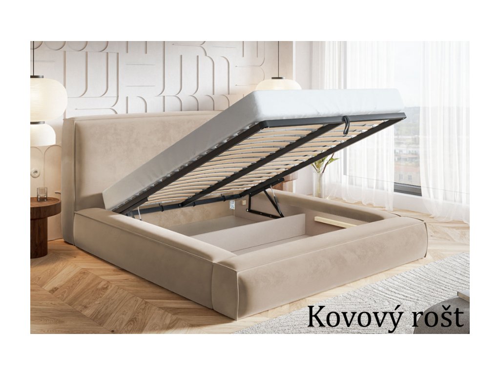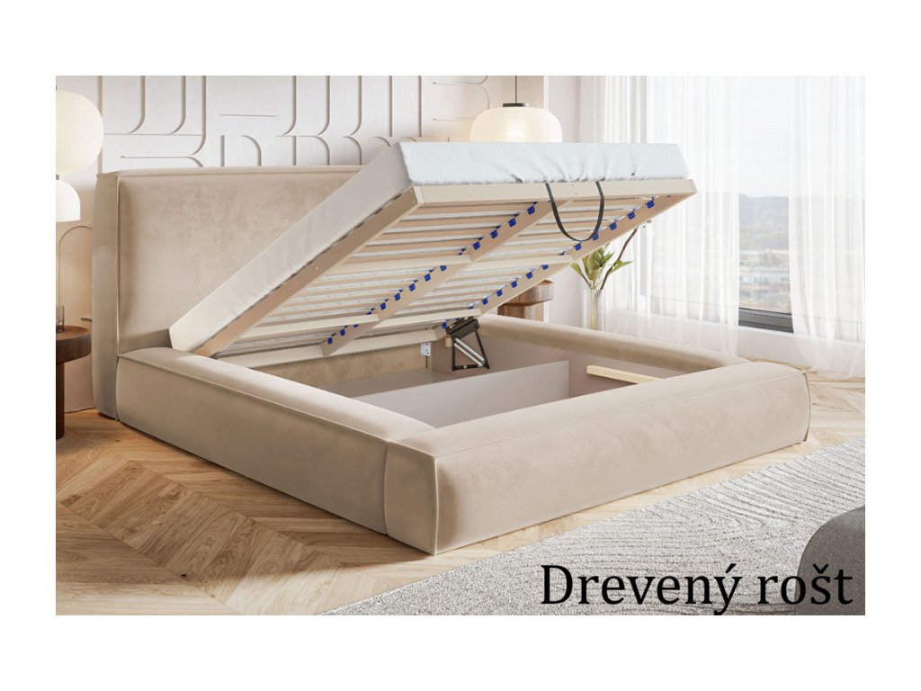 Konštrukcia postele je pevná a stabilná, čo zaručuje dlhú životnosť a komfortné používanie. Praktickým prvkom je veľkorysý úložný priestor ukrytý pod matracom, ktorý umožňuje efektívne uskladnenie posteľnej bielizne, sezónnych vecí alebo doplnkov. Výklopný mechanizmus zabezpečuje jednoduchý prístup do úložného priestoru bez námahy.