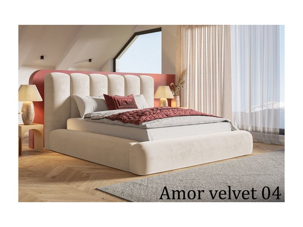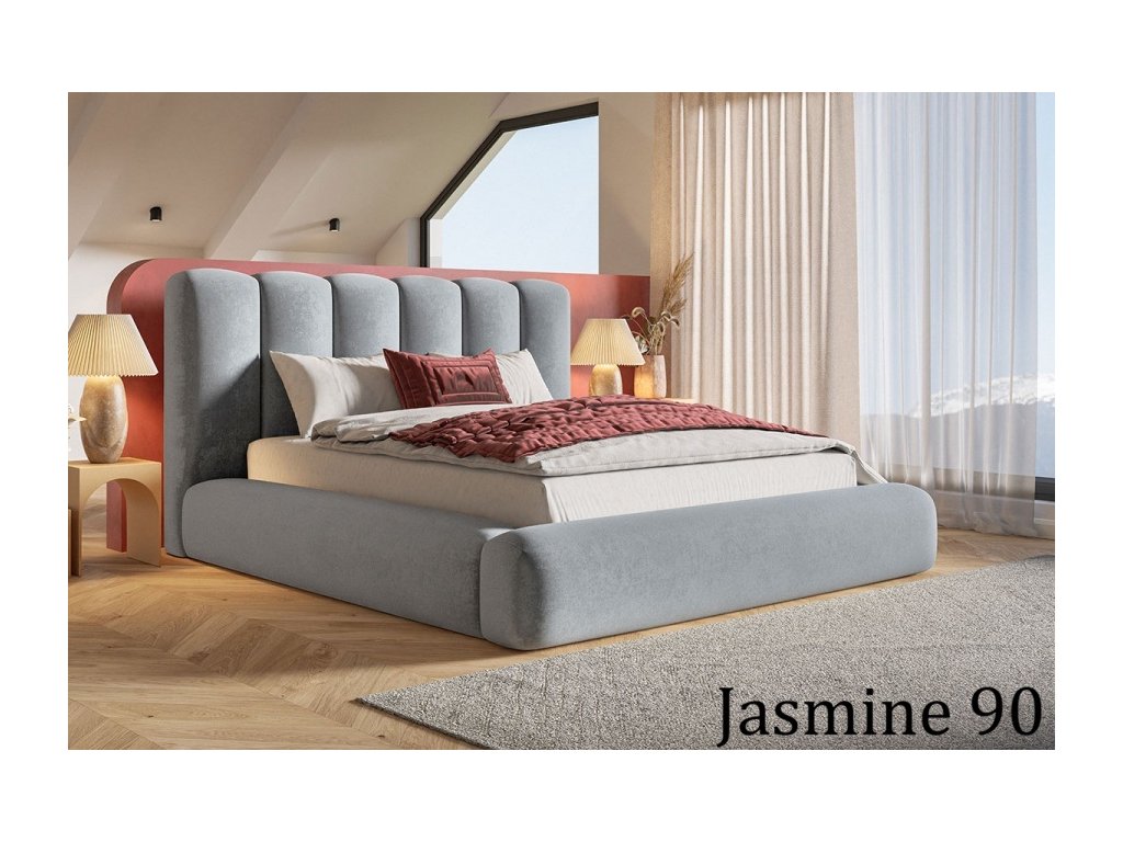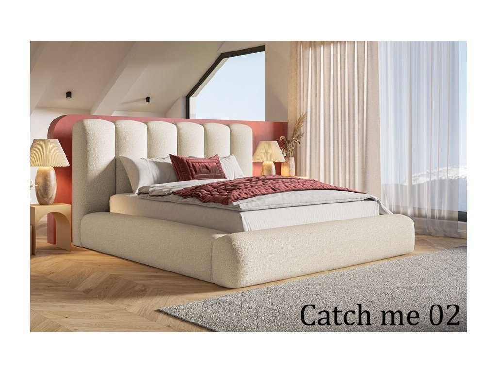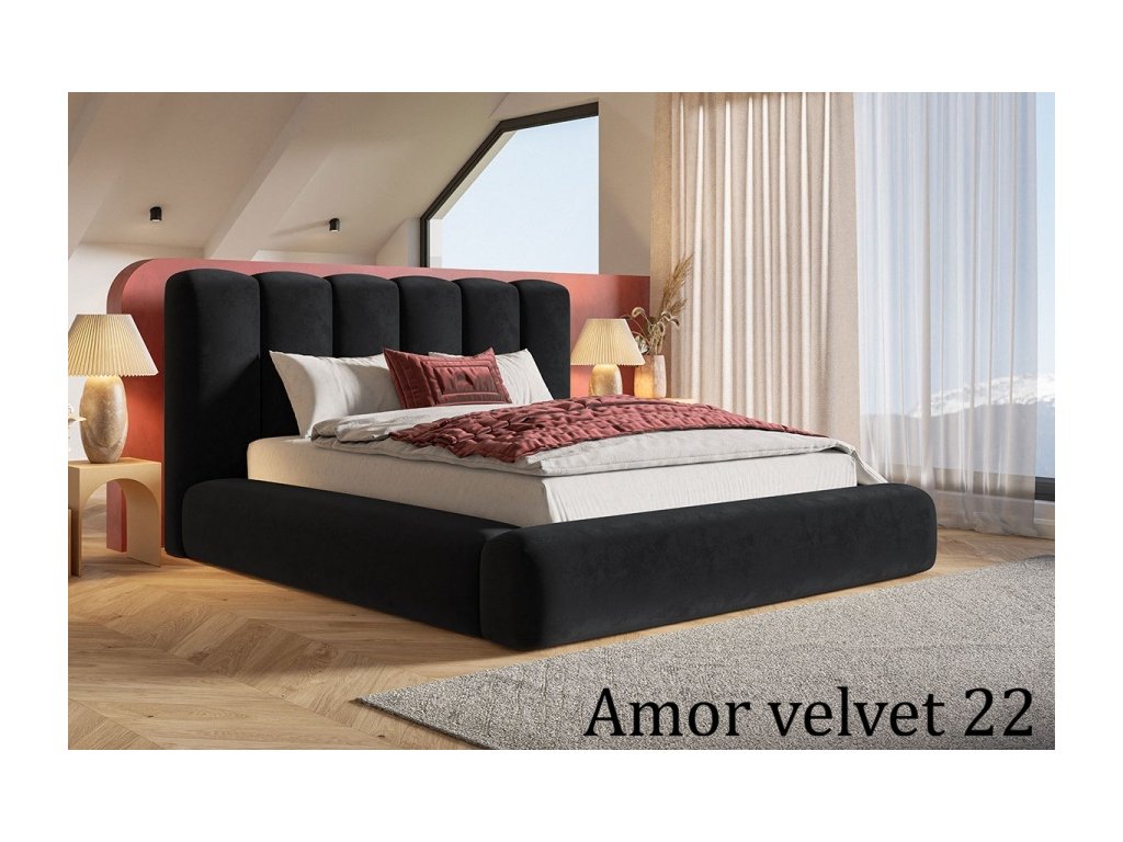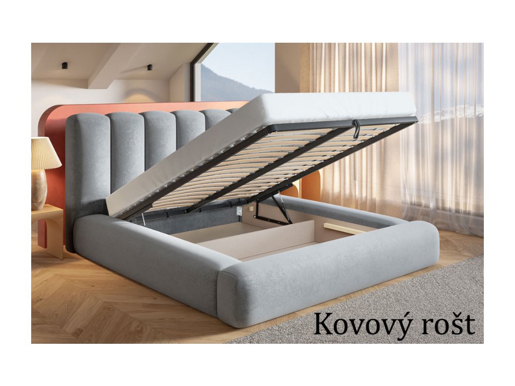 Moderná čalúnená posteľ s vysokým čelom, pevnou konštrukciou a praktickým úložným priestorom pod matracom. Dostupná s dreveným alebo kovovým roštom.