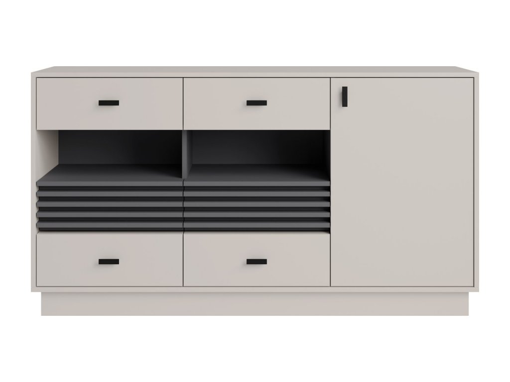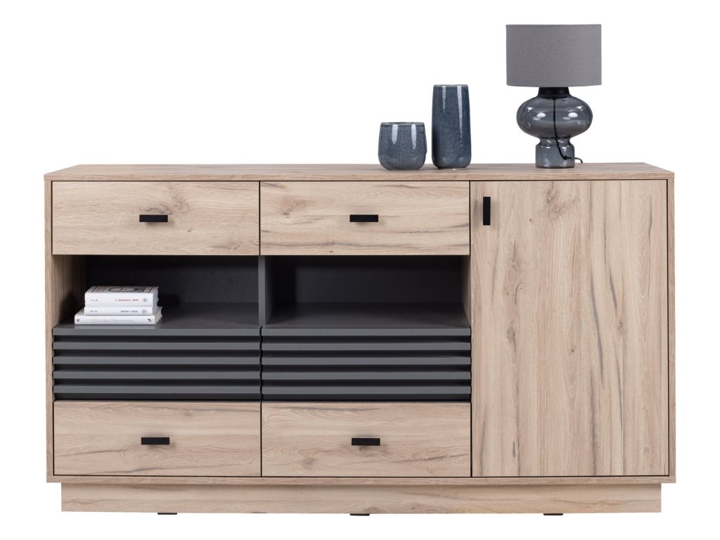 Moderná komoda so štyrmi zásuvkami, otvorenými policami a skrinkou ponúka praktický a prehľadný úložný priestor. Výrazný antracitový detail a kovové úchytky jej dodávajú štýlový, nadčasový vzhľad. Dostupná v 2 farebných prevedeniach.