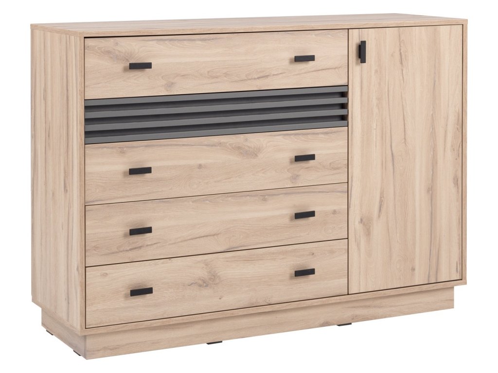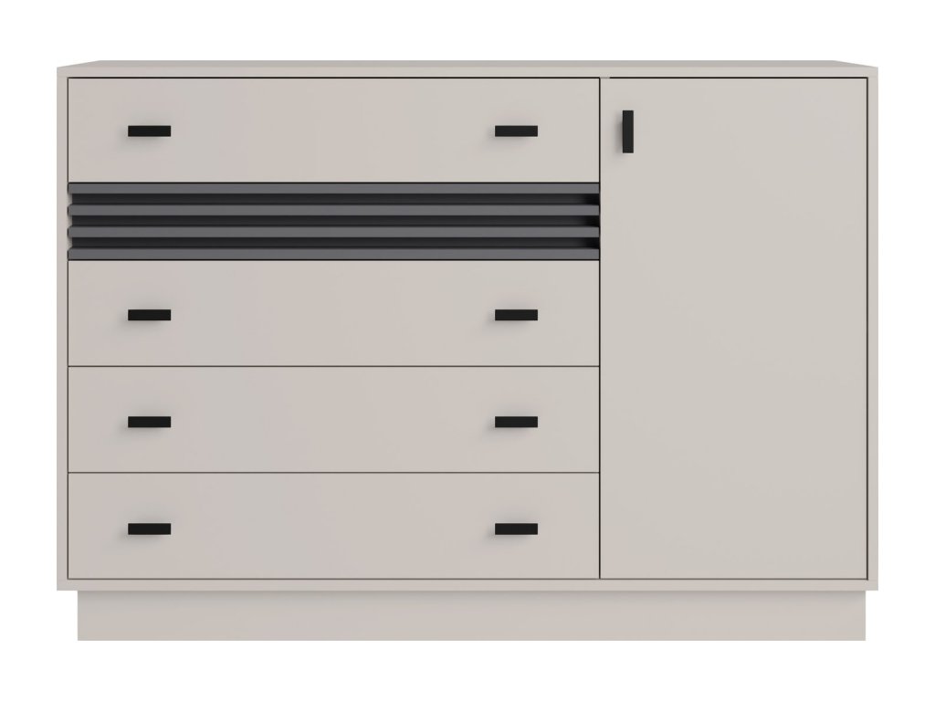 Moderná komoda s piatimi zásuvkami a skrinkou s policou ponúka dostatok úložného priestoru. Praktické členenie a čistý dizajn z nej robia ideálny doplnok do spálne aj obývačky.