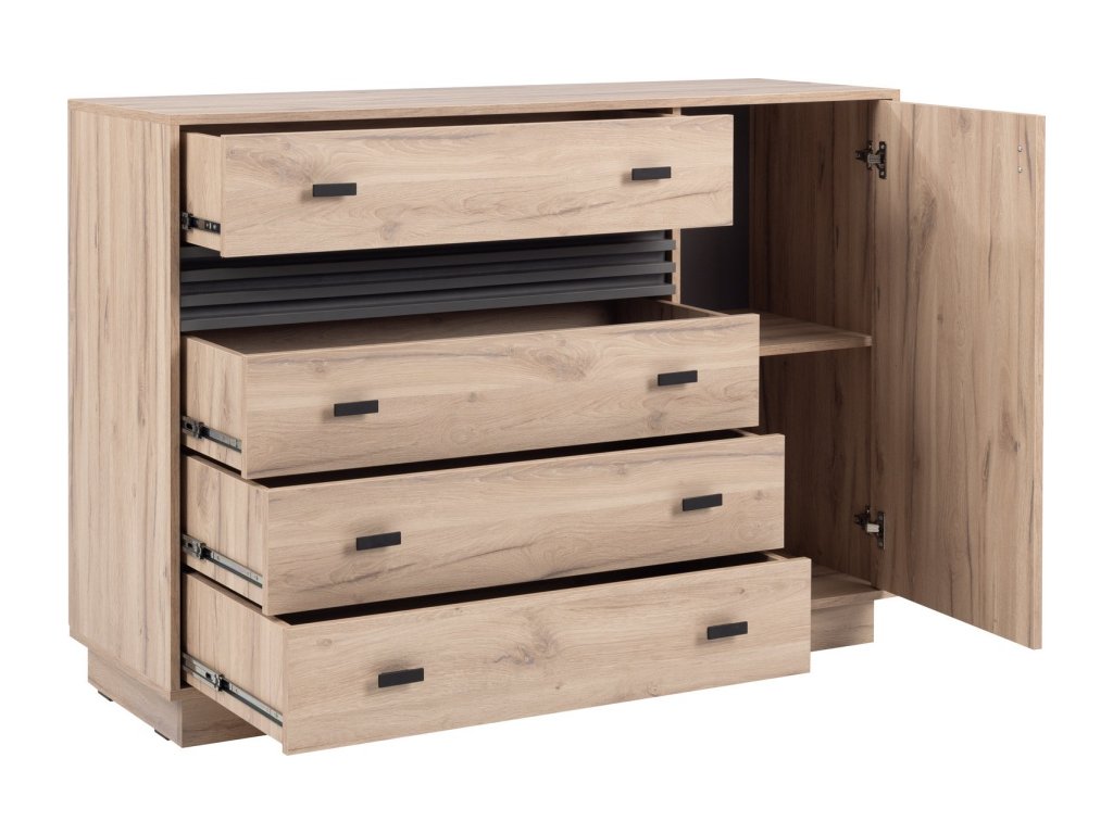 Komoda Allmo v modernom dizajne ponúka prakticky riešený úložný priestor v kombinácii zásuviek a skrinky s dvierkami. Obsahuje päť priestranných zásuviek, ktoré poskytujú dostatok miesta na prehľadné uskladnenie oblečenia či doplnkov. Na pravej strane sa nachádza uzatvárateľná skrinka s vnútornou policou, vhodná na uloženie väčších predmetov. Jednoduché úchytky a čisté línie podčiarkujú nadčasový vzhľad, vďaka čomu sa komoda hodí do spálne, obývačky aj predsiene.