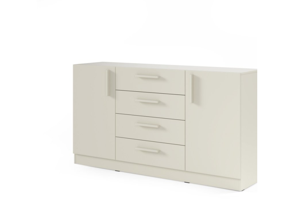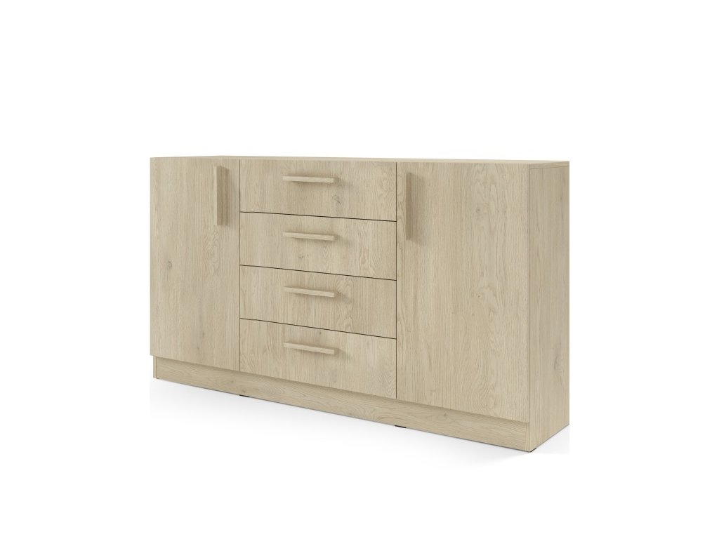 Komoda ponúka štyri priestranné zásuvky v strednej časti. Po bokoch sa nachádzajú skrinky s policami, ktoré poskytujú ďalší úložný priestor na väčšie predmety. Premyslené členenie zabezpečuje prehľadnosť a pohodlný prístup ku všetkým uloženým veciam.