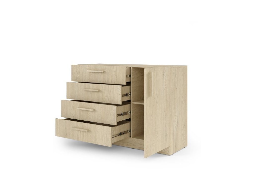 Komoda je rozdelená na dve časti. Na ľavej strane sa nachádzajú štyri priestranné zásuvky, vhodné na oblečenie, dokumenty alebo drobné predmety. Na pravej strane je skrinka s dvierkami a vnútornou policou. Zásuvky sú osadené kvalitným výsuvným mechanizmom pre plynulé a pohodlné používanie.