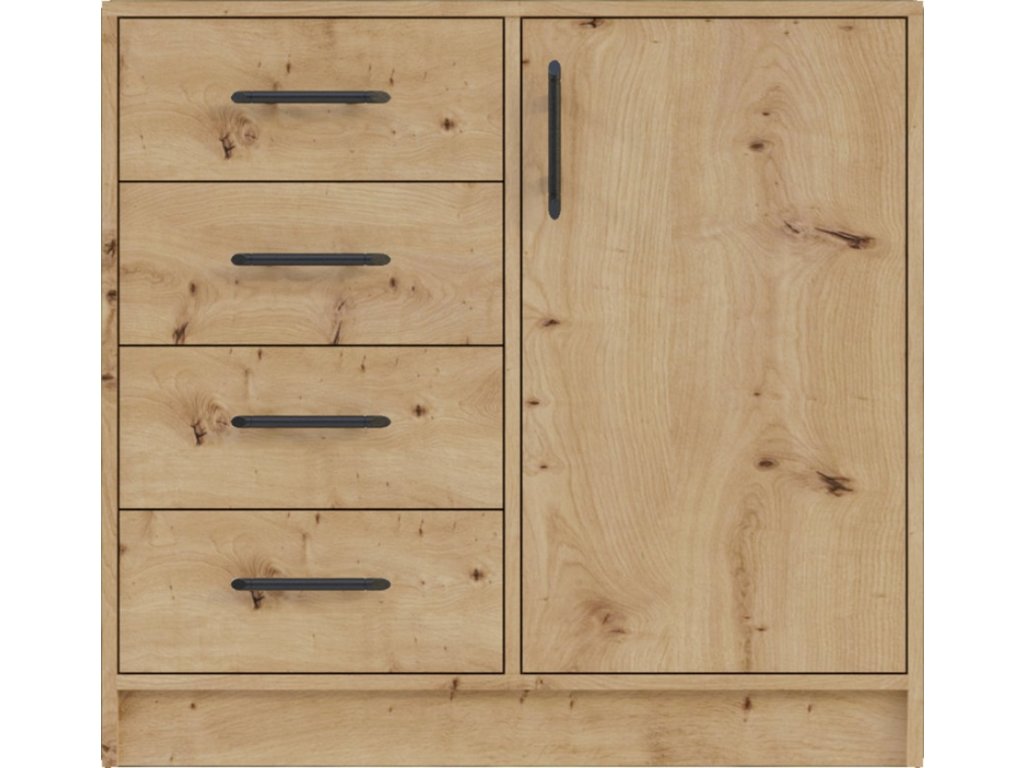 Komoda Smart v modernom prevedení ponúka praktickú kombináciu štyroch zásuviek a jednej skrinky s dvierkami. Poskytuje dostatok úložného priestoru na oblečenie, dokumenty aj drobnosti, pričom prehľadné členenie uľahčuje organizáciu.
