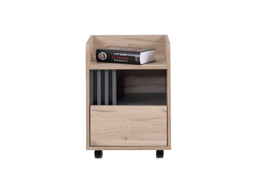 Horná otvorená polica je vhodná na odkladanie kníh, zošitov alebo dekorácií. Stredná časť je rozdelená vertikálnymi priečkami, ktoré vytvárajú priestor na prehľadné uloženie dokumentov, šanónov či časopisov. Spodná uzavretá zásuvka poskytuje dostatok miesta na uloženie drobností a vecí, ktoré chcete mať mimo dohľadu.
