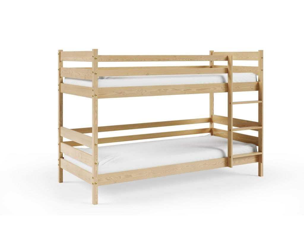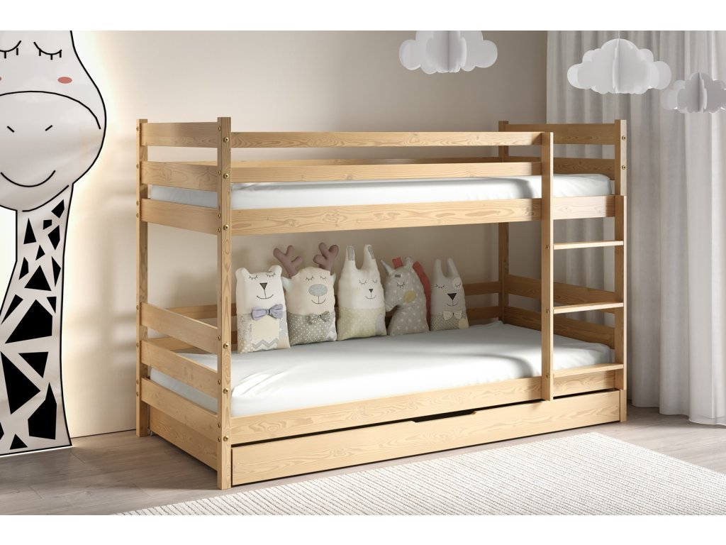 Drevená poschodová posteľ Pako s jednoduchým a funkčným dizajnom ponúka dve pohodlné lôžka nad sebou. Je vybavená bočnými zábranami pre bezpečný spánok a stabilným rebríkom na prístup k hornému lôžku. Vyrobená je z borovicového masívu, ktoré pôsobí teplo a príjemne. V spodnej časti sa nachádza výsuvný šuplík, ideálny na uloženie posteľnej bielizne alebo hračiek.