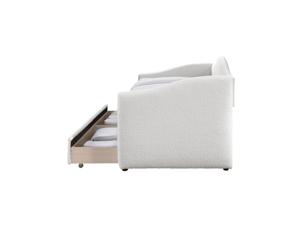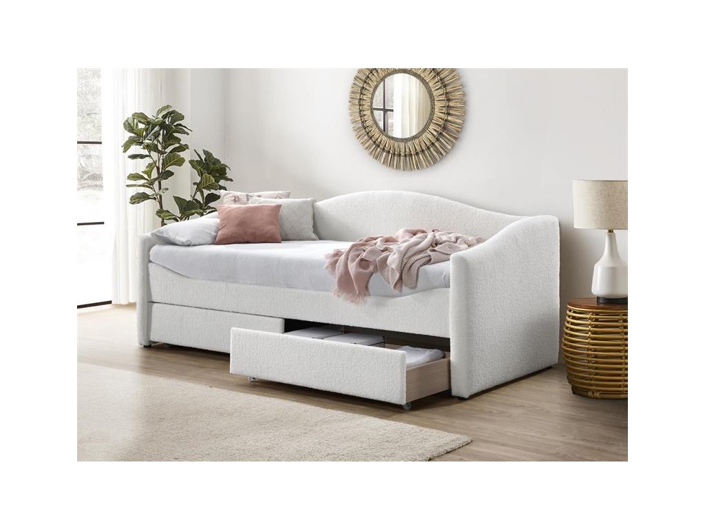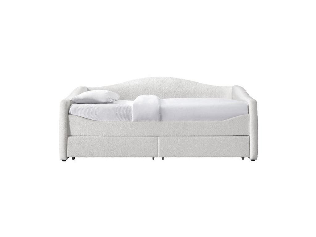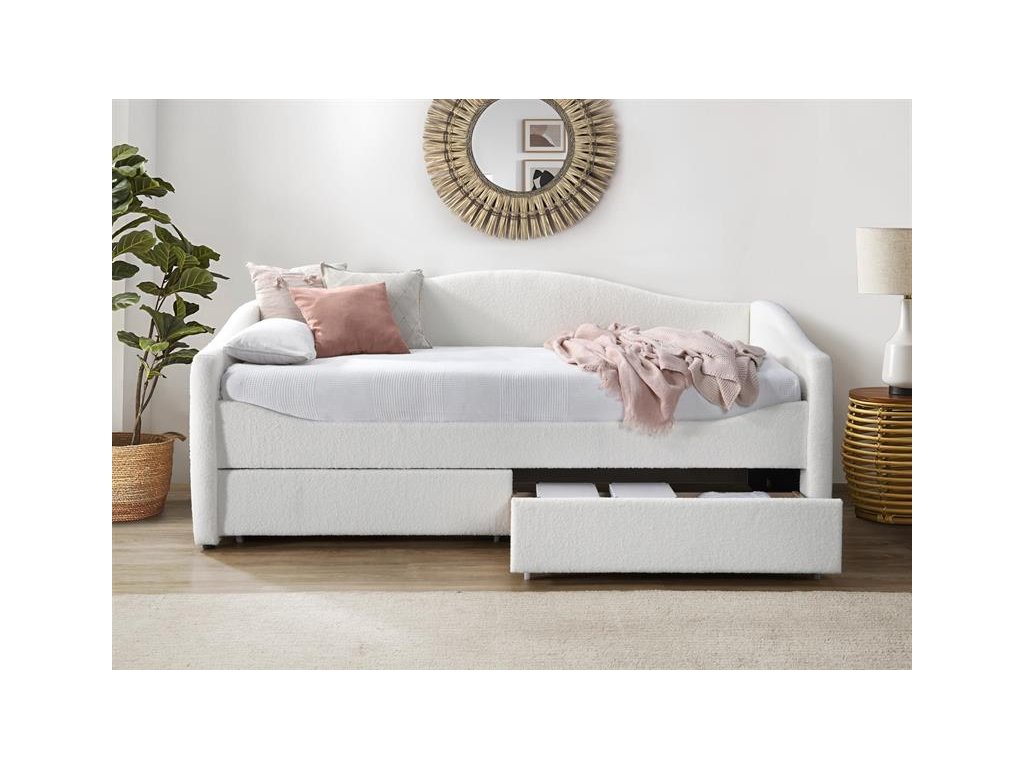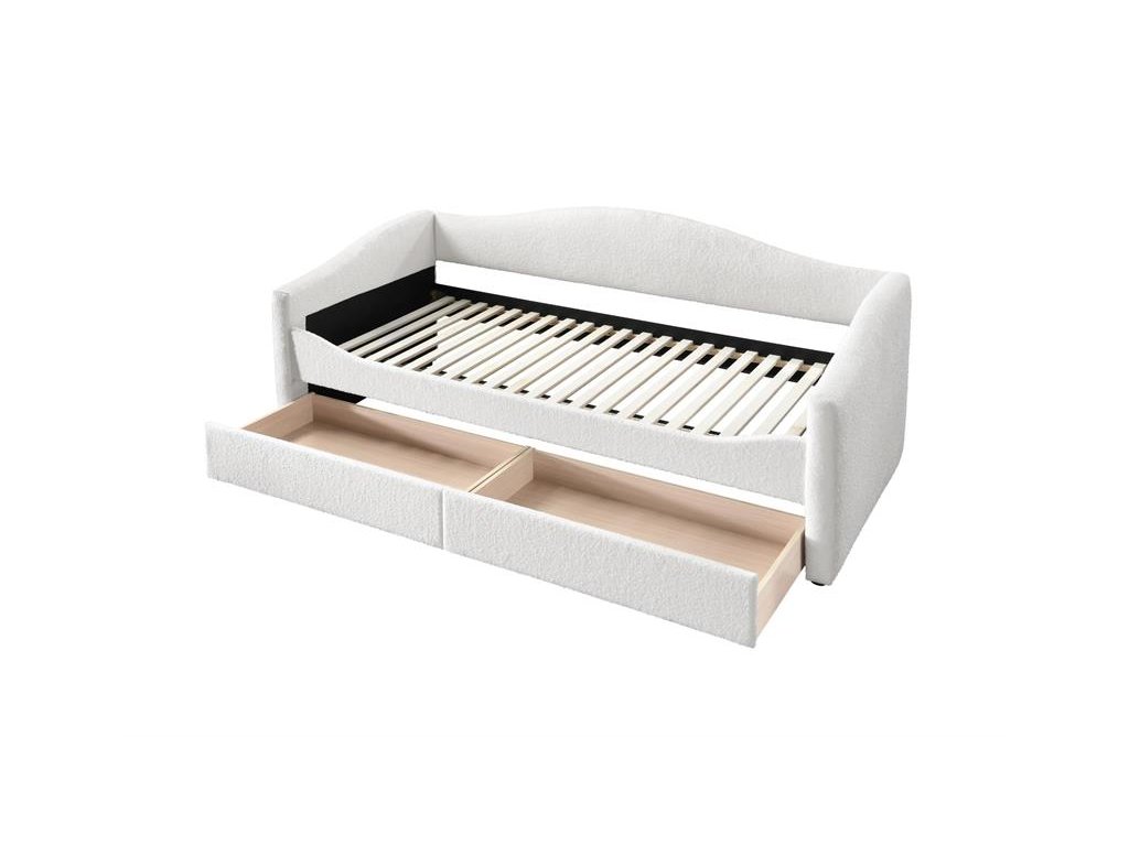 Štýlová posteľ Caydence s úložným priestorom spája moderný dizajn s praktickým využitím. Čalúnenie z mäkkej, krémovo bielej látky pôsobí elegantne a príjemne, zatiaľ čo jemne zaoblené línie dodávajú posteli jemný, nadčasový vzhľad. Praktické výsuvné zásuvky poskytujú dostatok miesta na uloženie lôžkovín, sezónneho oblečenia či iných drobností, vďaka čomu je posteľ ideálnym riešením pre menšie priestory alebo detské izby.