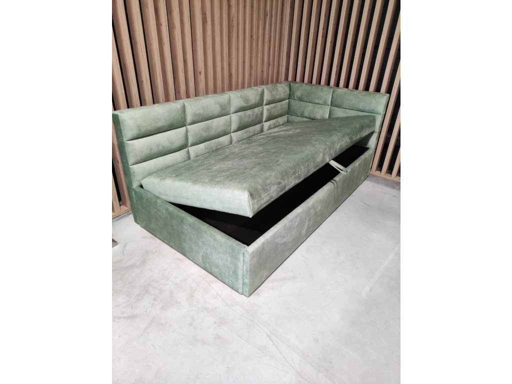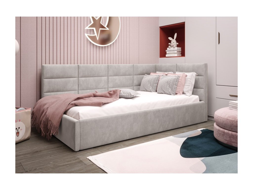 Detská čalúnená posteľ s prešívaným čelom a výklopným roštom ponúka pohodlné, bezpečné spanie a praktický úložný priestor.