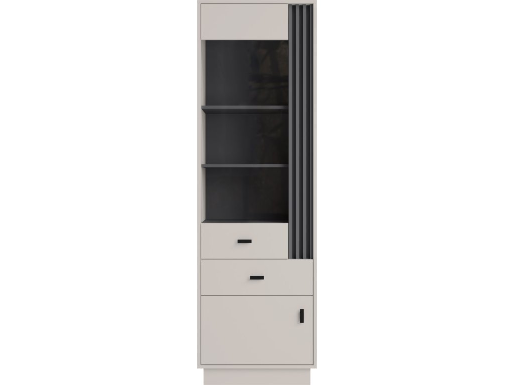 Moderný regál s otvorenými policami, zásuvkami a skrinkou ponúka praktický úložný aj výstavný priestor. Výrazný antracitový vertikálny detail a kovové úchytky dodávajú nábytku štýlový, nadčasový vzhľad. Dostupný v 2 farebných prevedeniach.