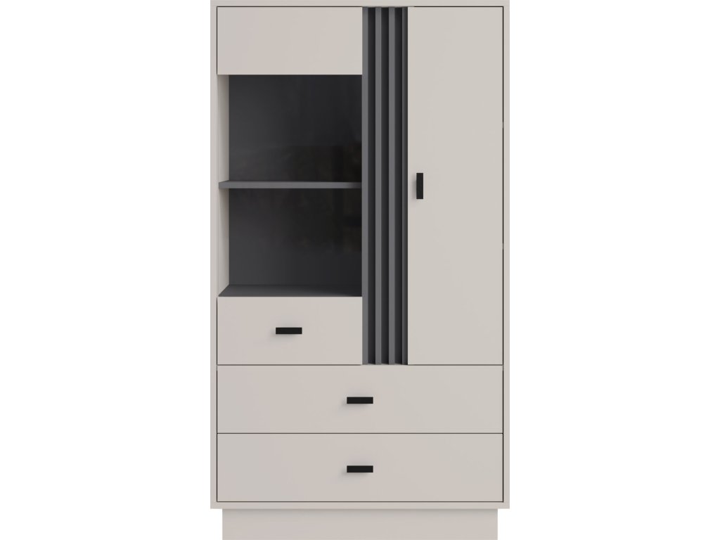 Moderný kombinovaný regál s otvorenou policovou časťou, skrinkou a tromi zásuvkami ponúka praktický úložný priestor. Výrazný antracitový detail a kovové úchytky dodávajú nábytku štýlový, nadčasový vzhľad.