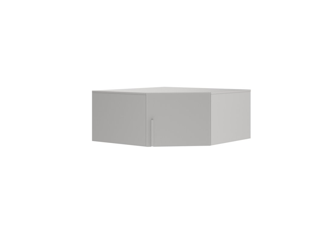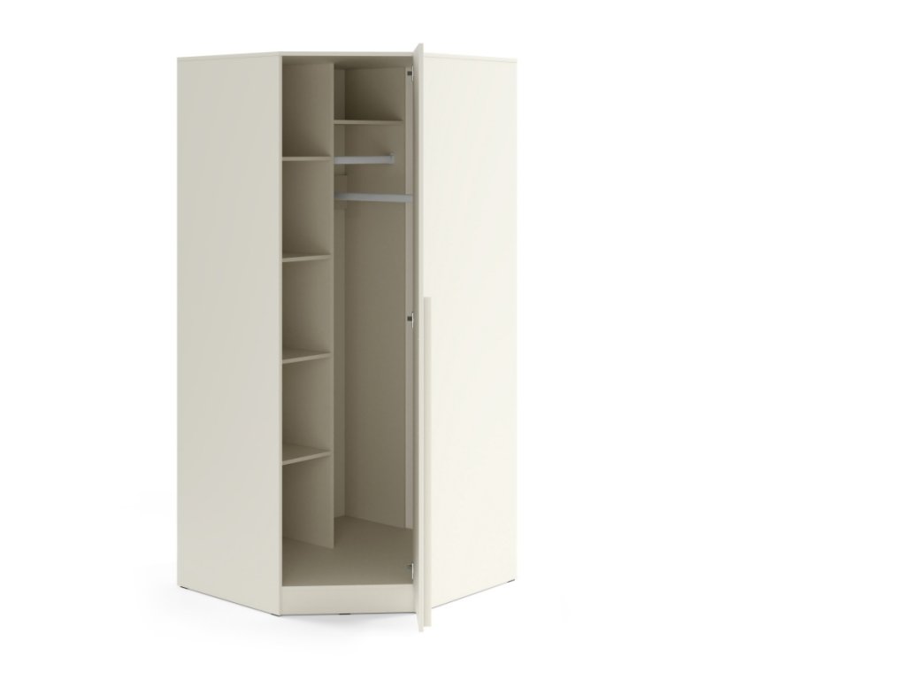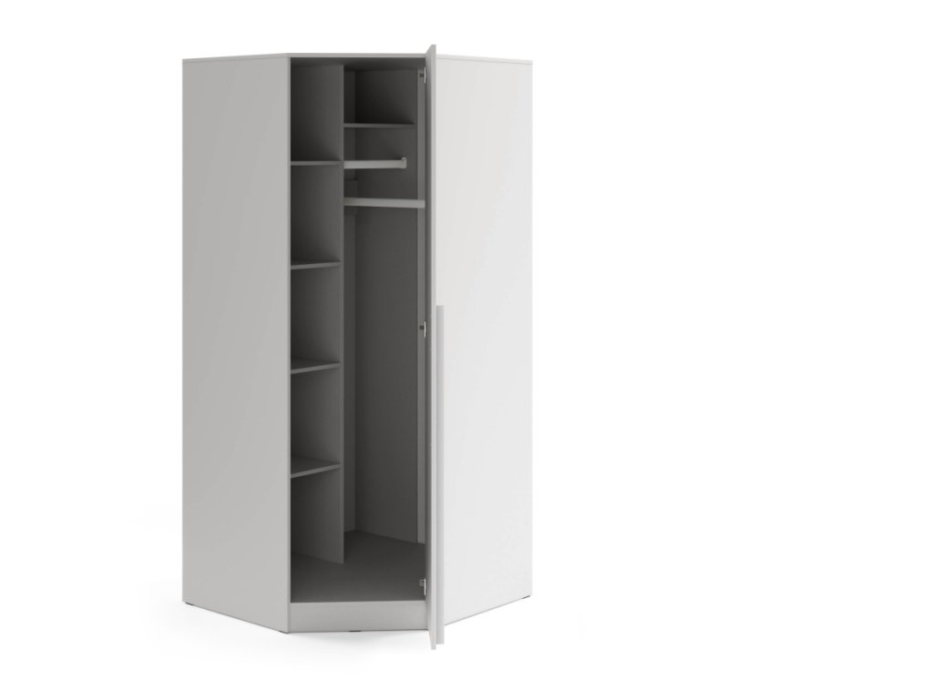 Rohová šatníková skriňa s policami a vešiakovou tyčou, dostupná vo viacerých farebných prevedeniach.