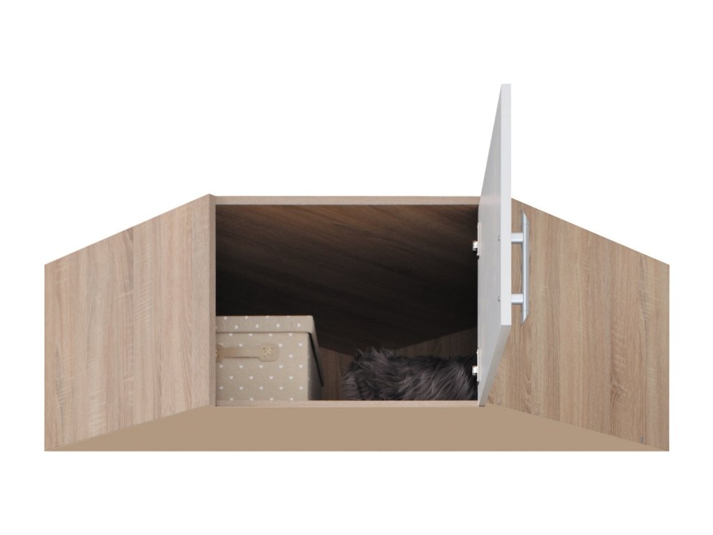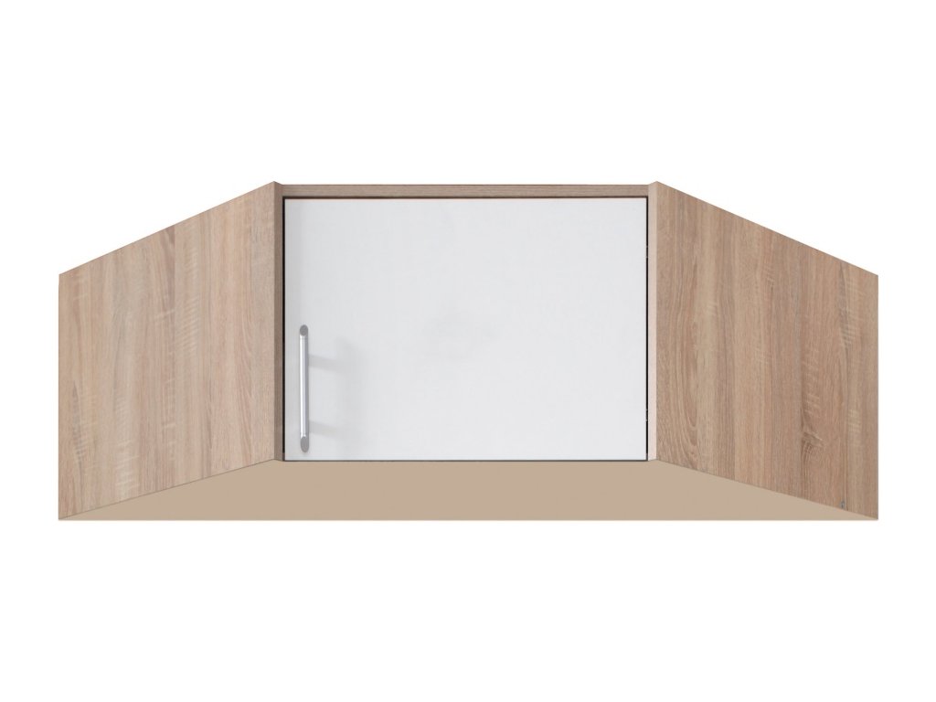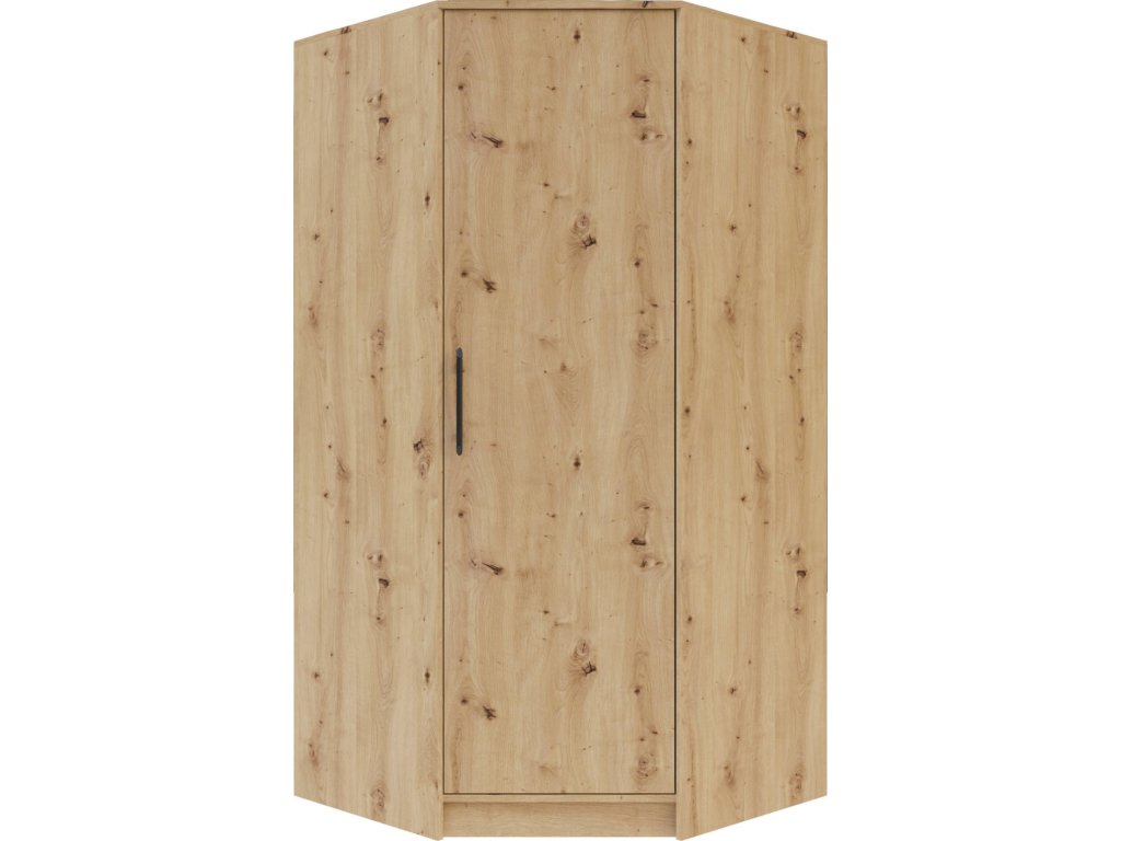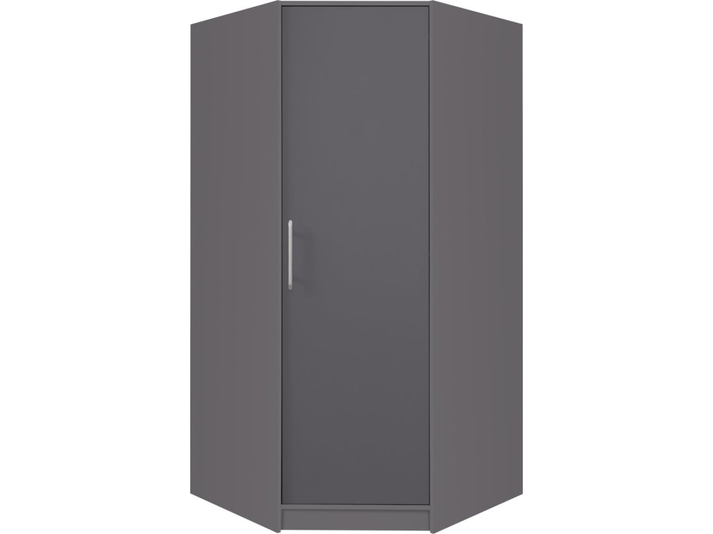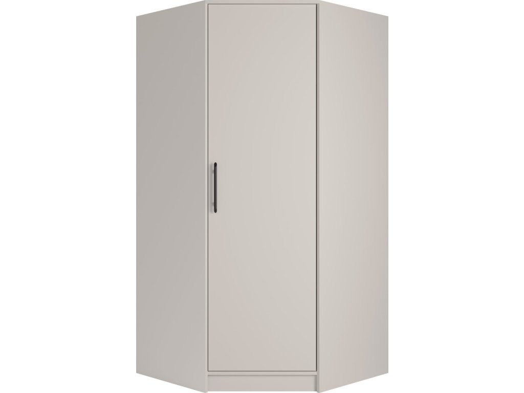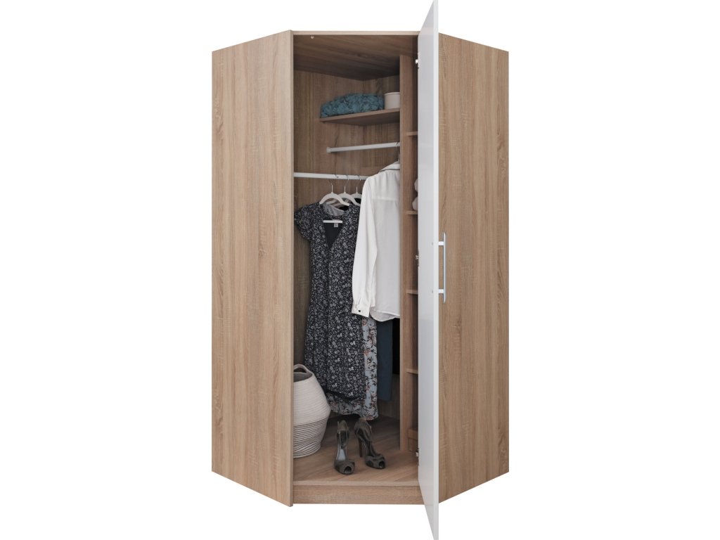 Rohová šatníková skriňa efektívne využíva priestor a ponúka vešiakovú tyč aj hornú policu. Možnosť doobjednania nadstavca pre väčší úložný priestor. Dostupná v 4 farebných prevedeniach.