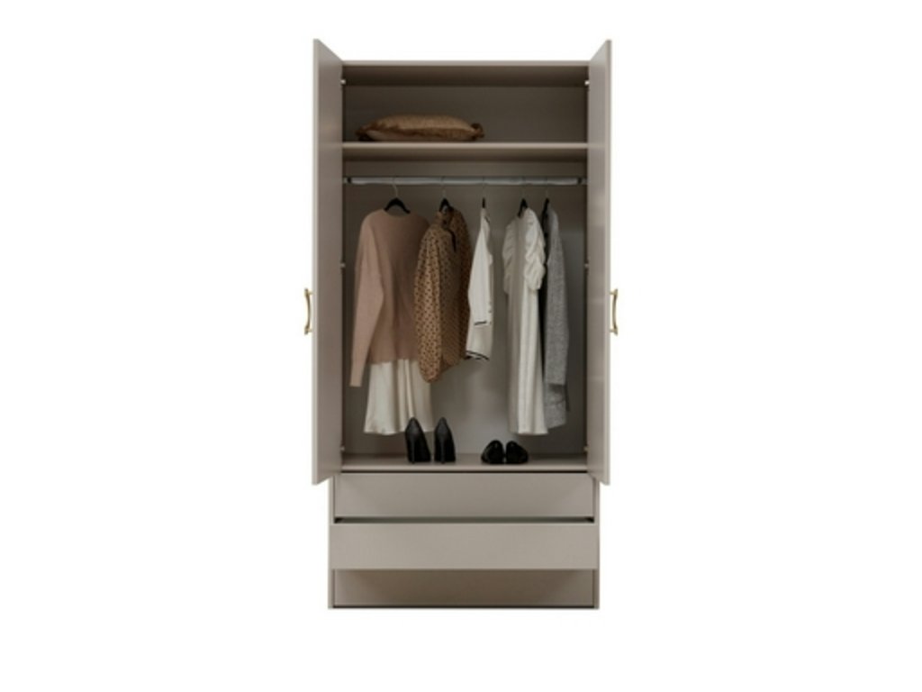 Elegantná šatníkova skriňa zo spálňového kompletu NUBO. Obsahuje dostatok priestoru pre všetky Vaše osobné a izbové nevyhnutnosti. Zásuvka sa otvára pomocou mechanizmu "klik-klak".