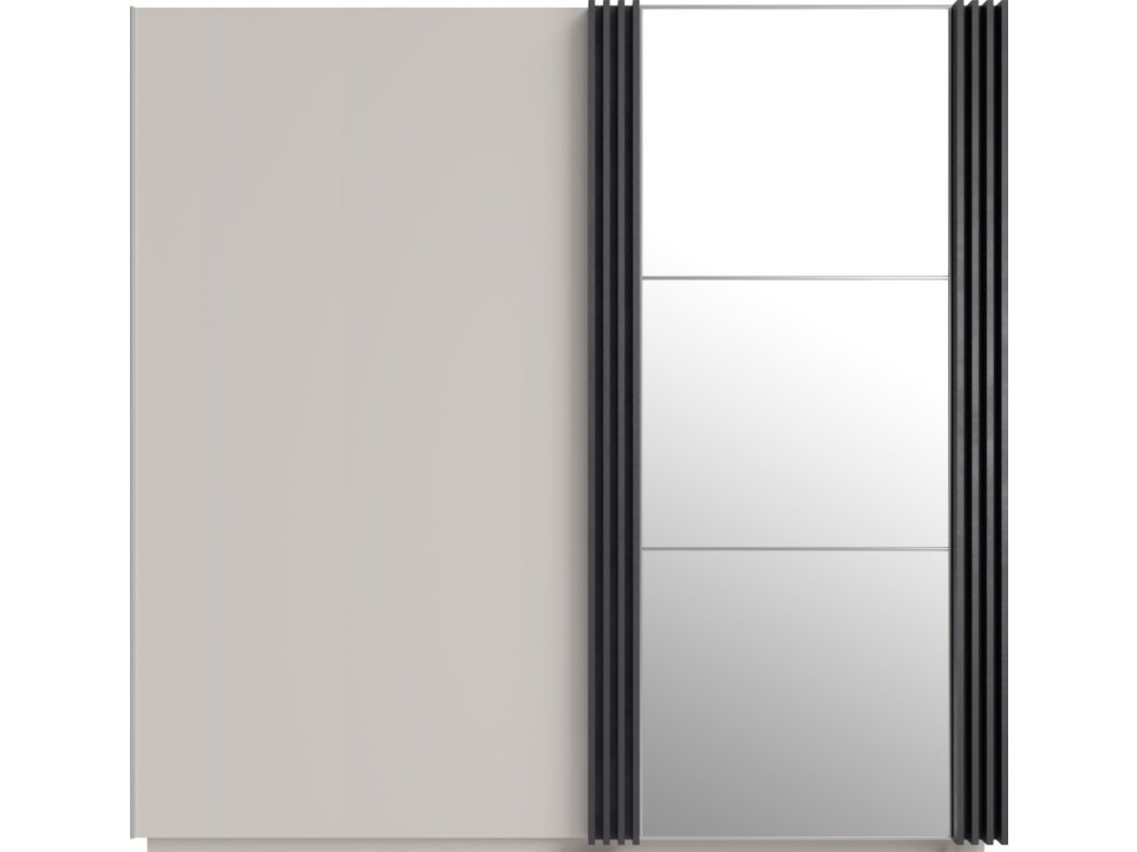 Vnútorný priestor je funkčne rozdelený – jedna časť je vybavená šatníkovou tyčou a hornou policou na zavesené oblečenie, druhá časť obsahuje viacero políc vhodných na skladanie oblečenia alebo doplnkov. Posuvný systém dverí šetrí miesto a zabezpečuje pohodlné používanie aj v menších miestnostiach.