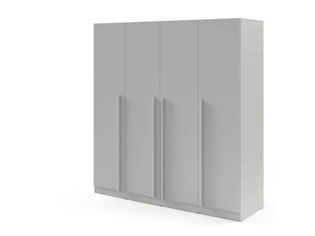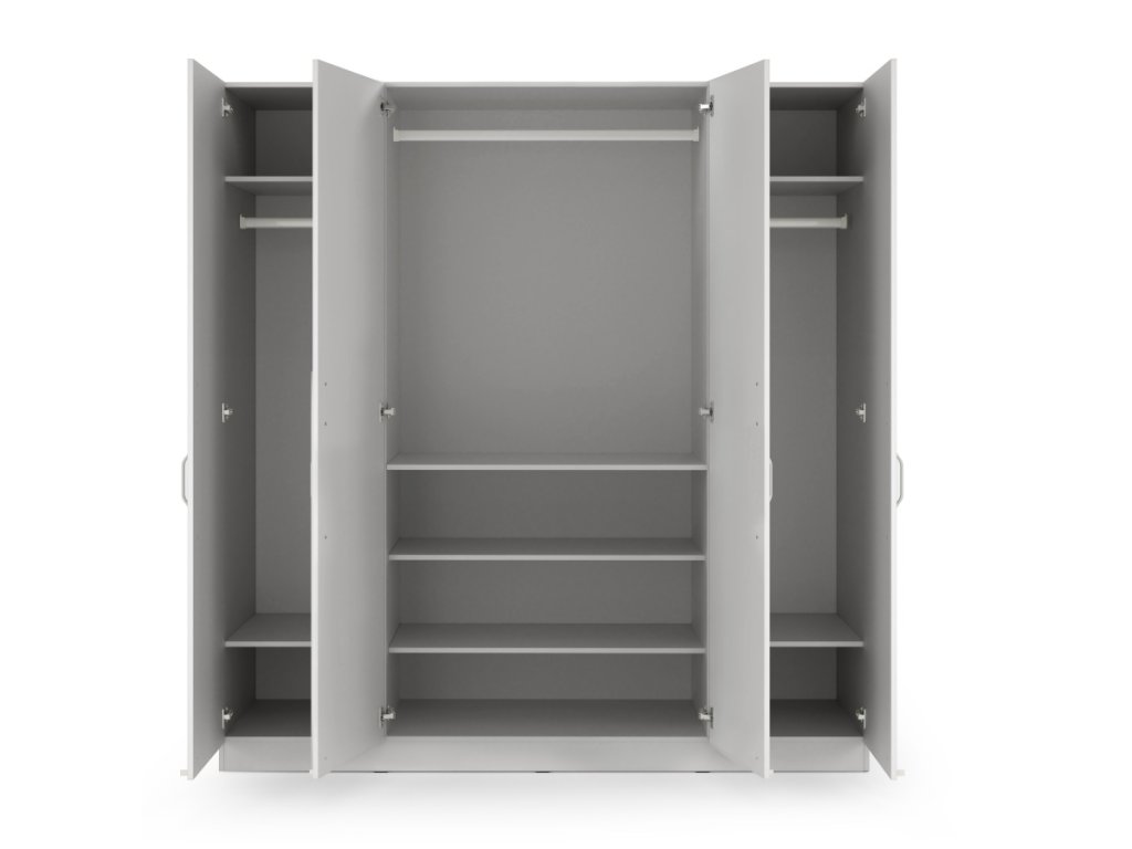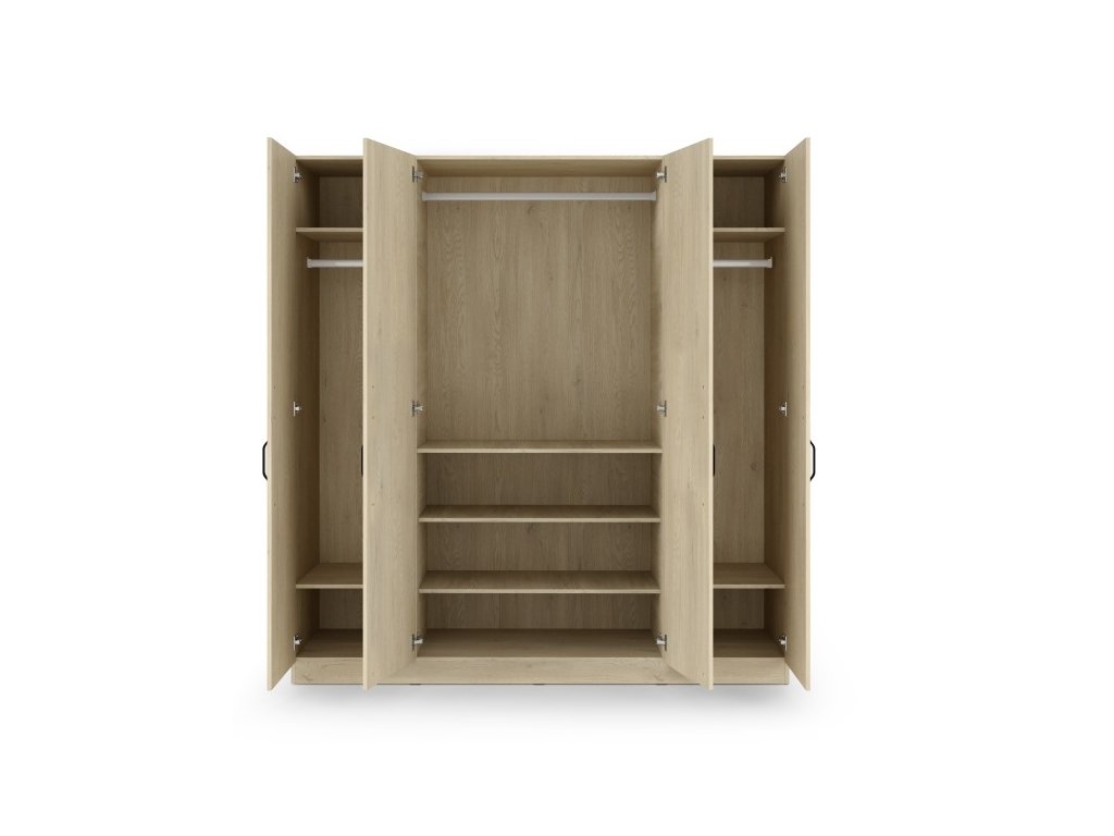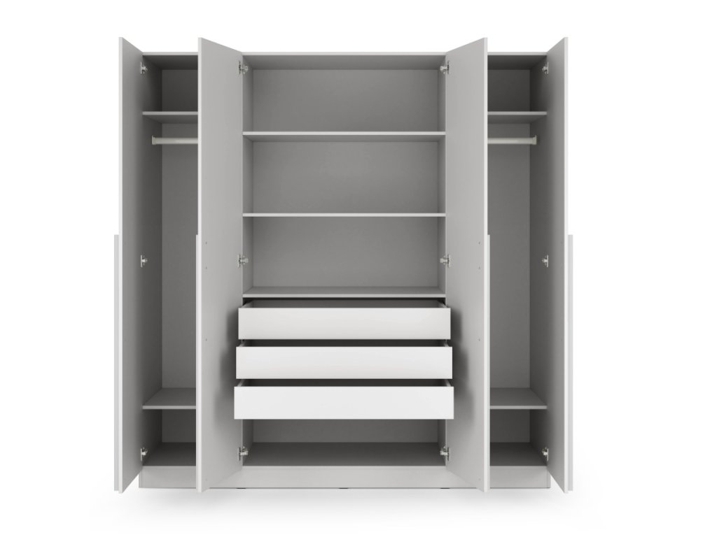 Moderná šatníková skriňa so 4 dverami, policami a vešiakovými tyčami. Dostupná v dvoch variantoch – so zásuvkami alebo bez zásuviek.