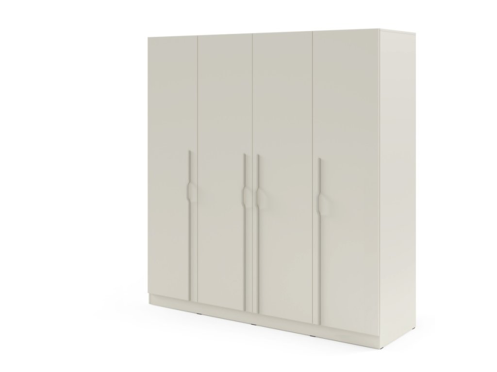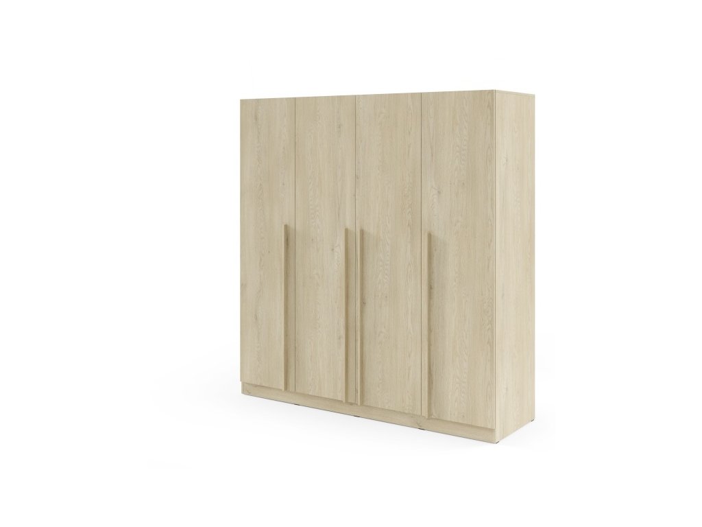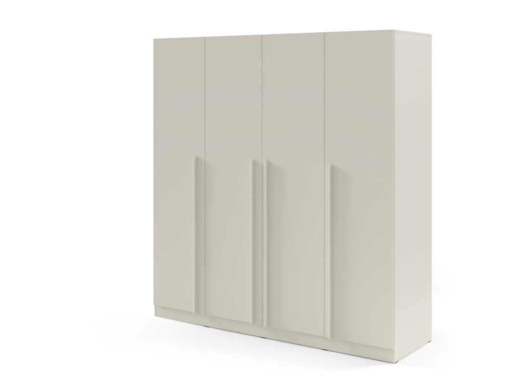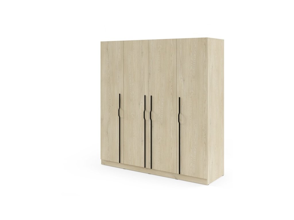 Moderná šatníková skriňa so 4 dverami, policami a vešiakovými tyčami. Dostupná v dvoch variantoch – so zásuvkami alebo bez zásuviek.