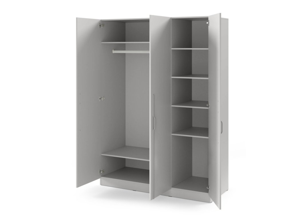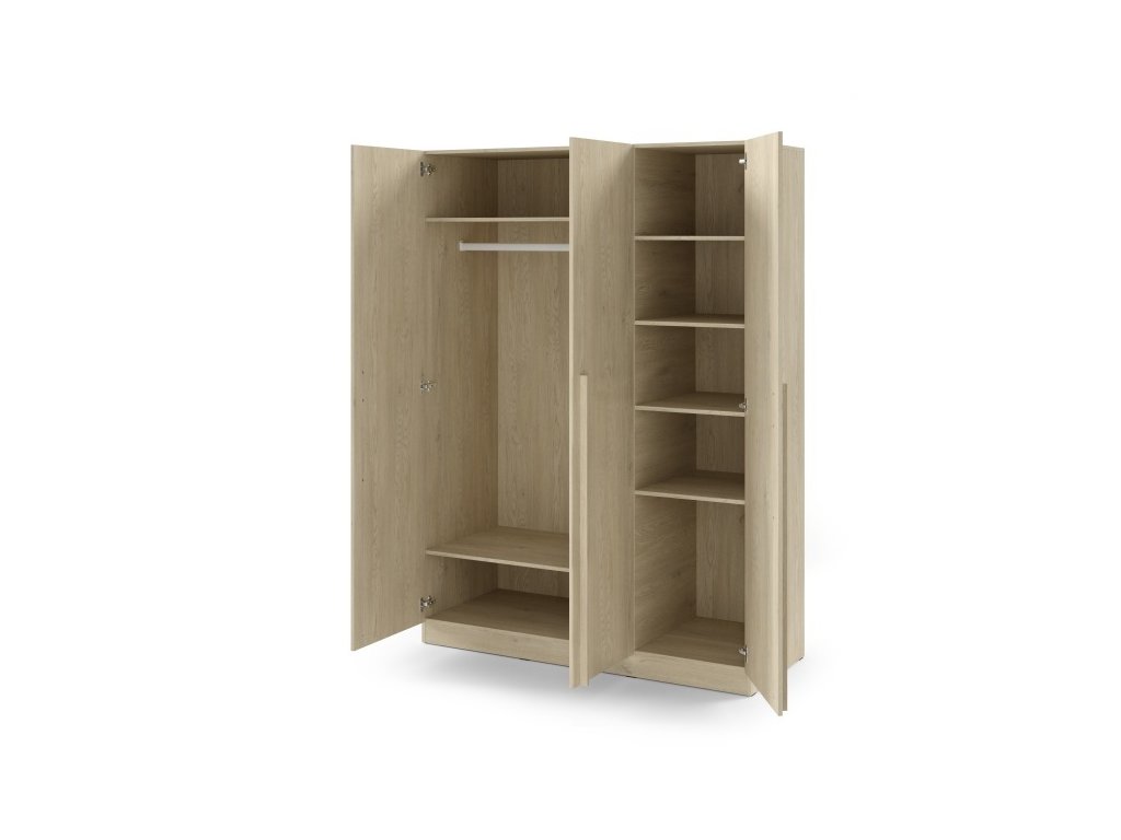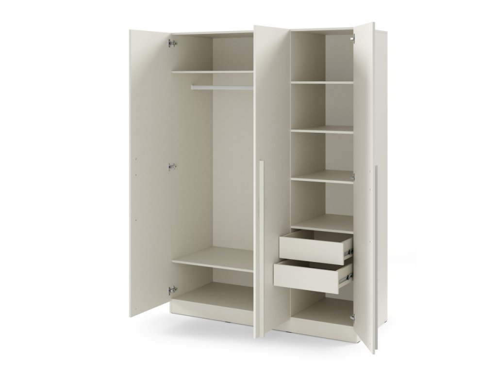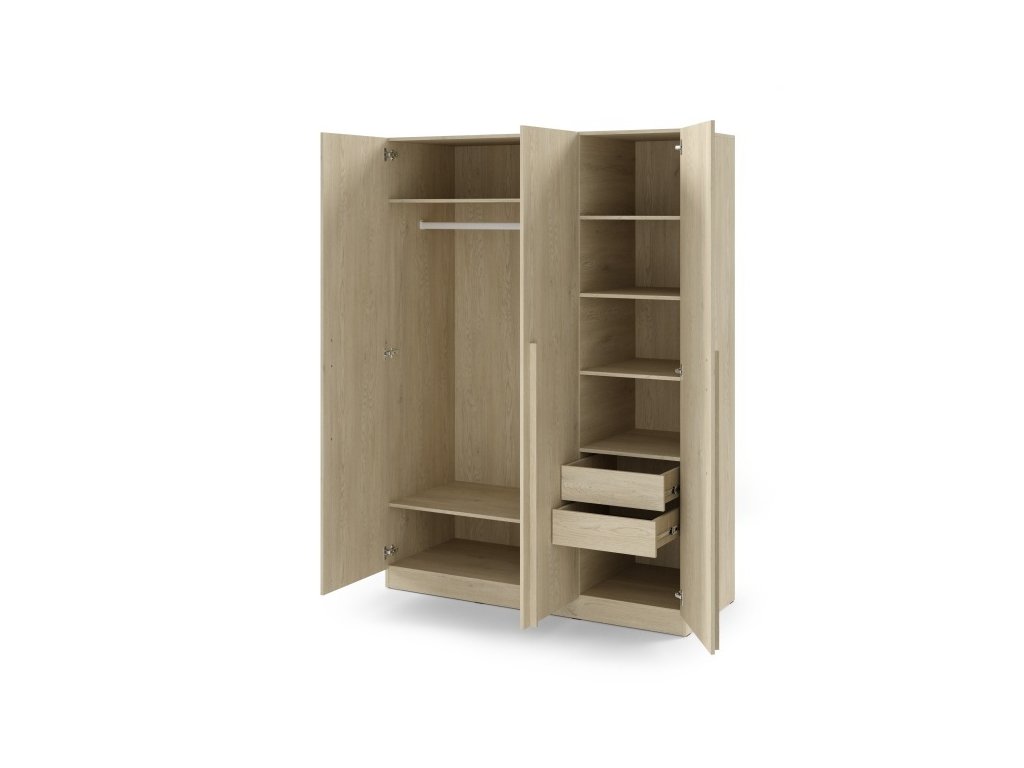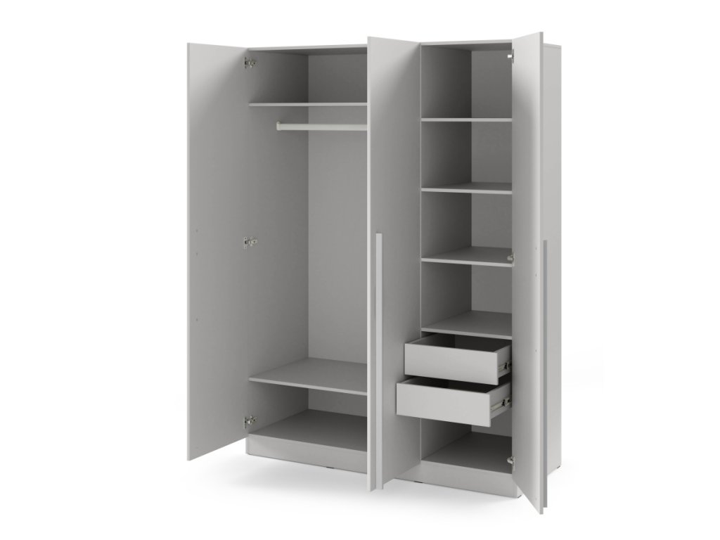 Skriňa ponúka prehľadné vnútorné usporiadanie s policami a vešiakovou tyčou. K dispozícii sú dve varianty prevedenia – so zásuvkami, ktoré poskytujú priestor na bielizeň a doplnky, alebo bez zásuviek, kde je stredná časť riešená vešiakovou tyčou pre viac miesta na zavesené oblečenie.