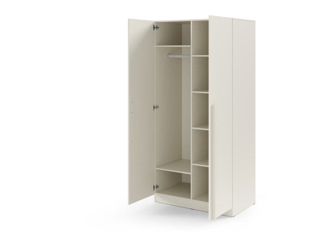 Vnútorné usporiadanie je navrhnuté pre maximálnu prehľadnosť. Skriňa ponúka vešiakovú tyč na zavesené oblečenie a viacero políc. Premyslené členenie umožňuje efektívne využitie priestoru aj v menších miestnostiach.