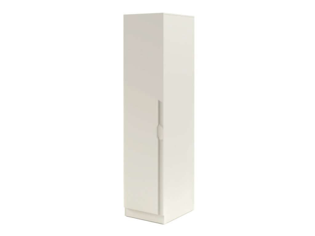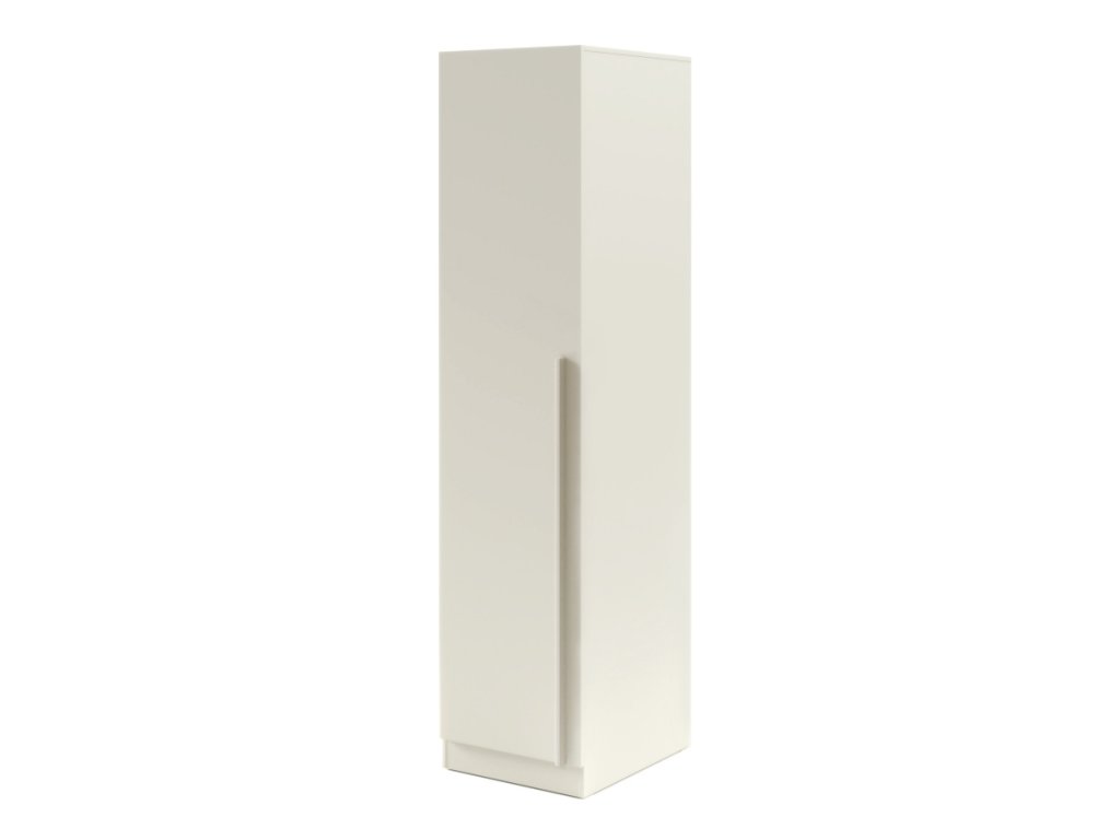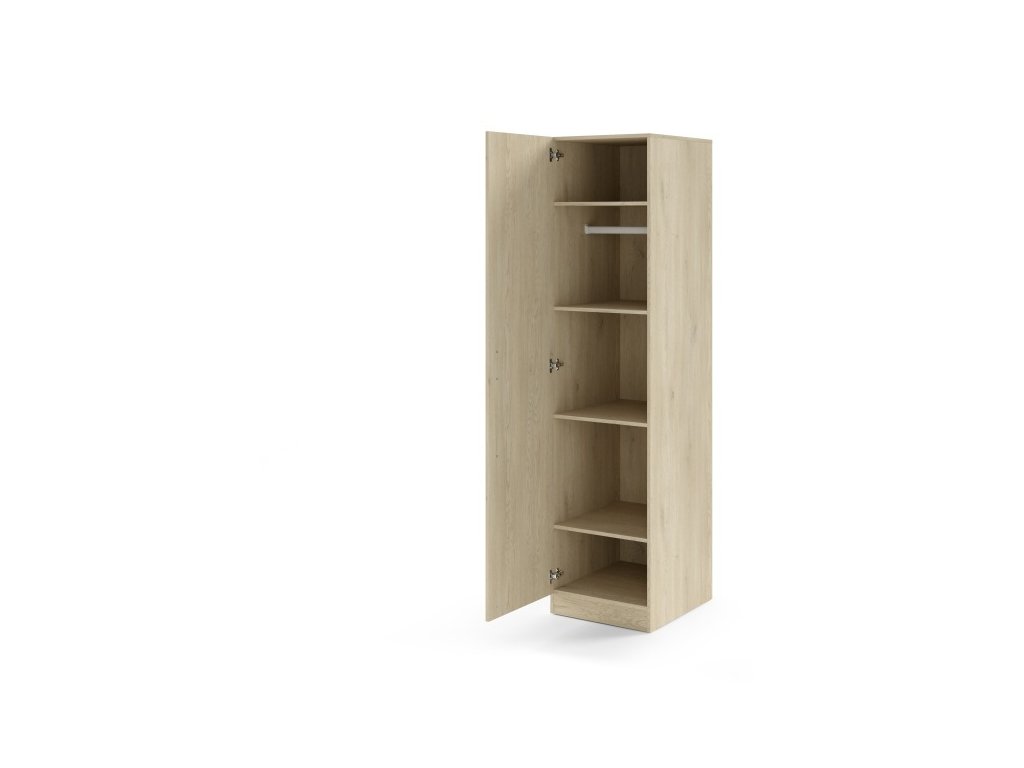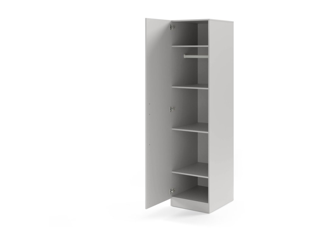 Elegantná úzka šatníková skriňa s policami a vešiakovou tyčou, ideálna aj do menších priestorov. Dostupná vo viacerých farbách, s možnosťou dokúpenia nadstavca.