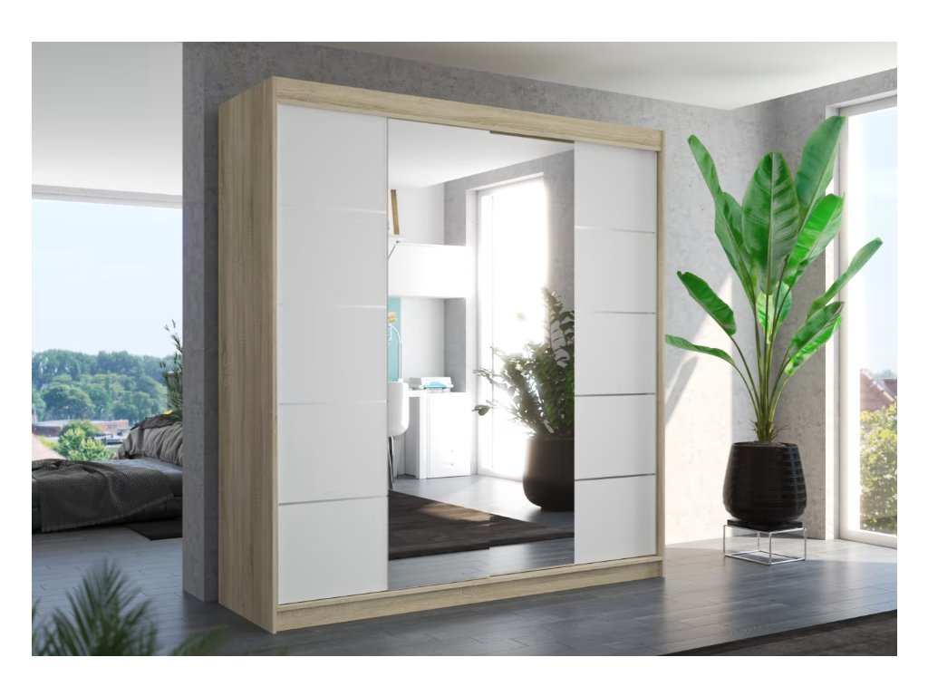 Šatníková skriňa Dalmatia je praktickým a štýlovým doplnkom do domácnosti, ktorý pomáha udržať veci prehľadne usporiadané. Disponuje priestrannými policami a vešiakovou tyčou, ideálnou na zavesenie oblečenia. Zrkadlo na dverách spolu so striebornými dekoračnými pásmi jej dodávajú elegantný a moderný vzhľad. Vďaka posuvnému systému je ideálna do priestorovo obmedzených miestností, kde záleží na každom centimetri.