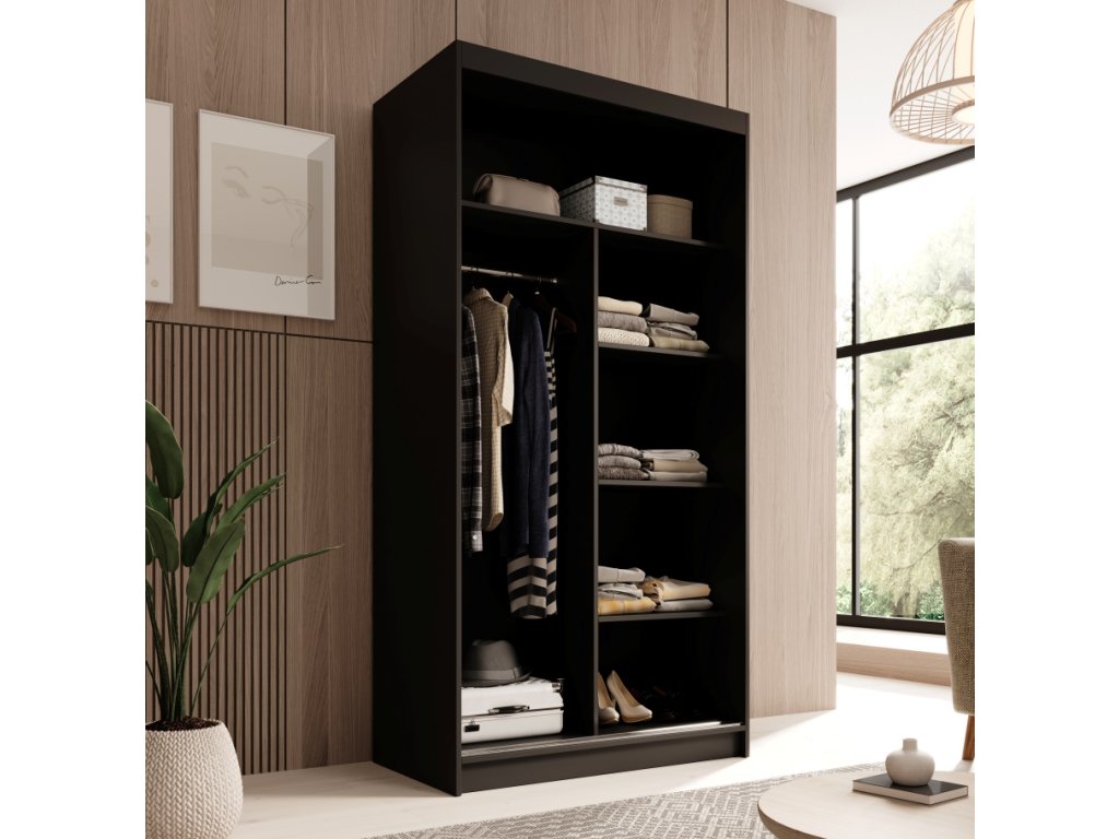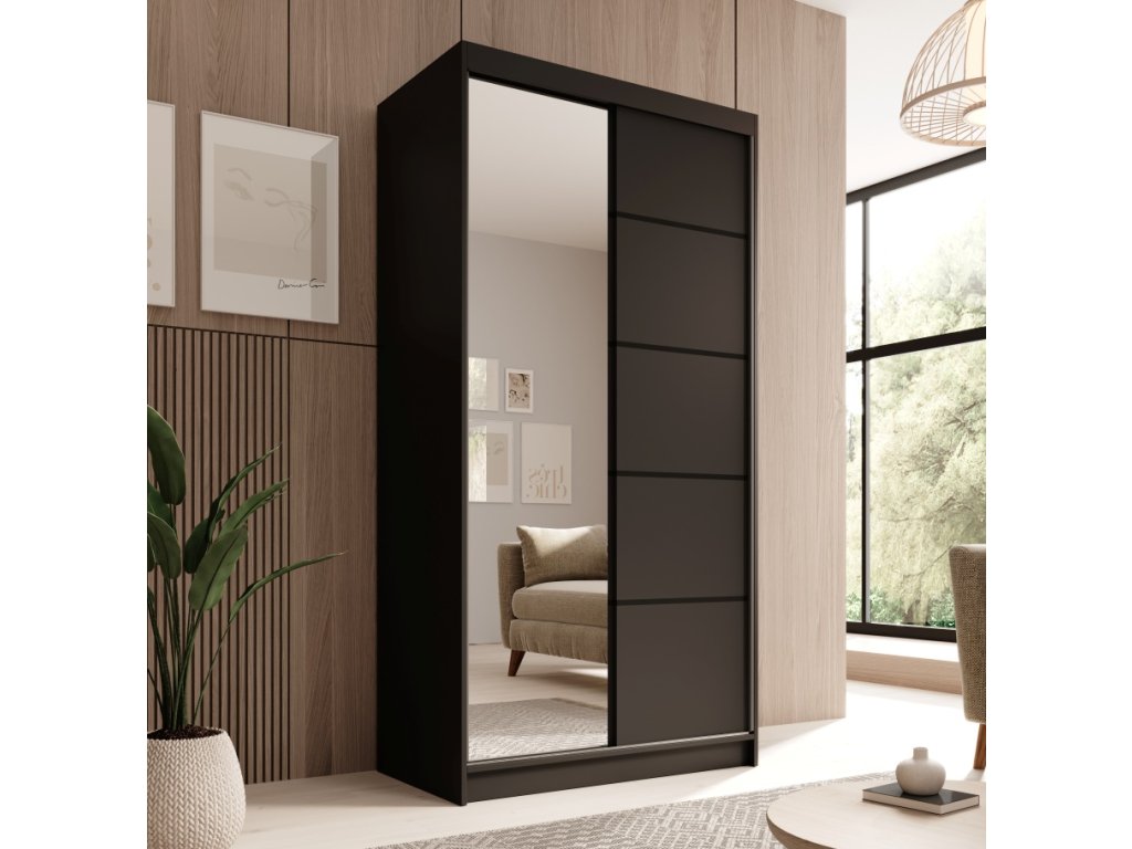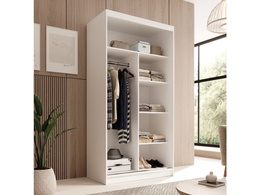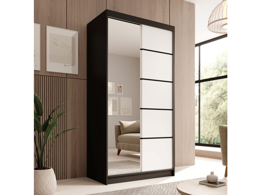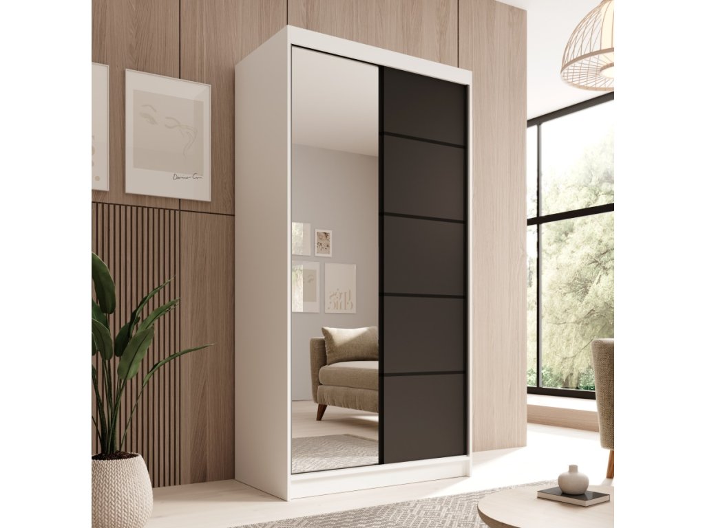 Šatníková skriňa Laurencja spája moderný dizajn s praktickými riešeniami pre každodenné využitie. Vďaka posuvným dverám šetrí priestor a jedna z nich je doplnená veľkým zrkadlom, ktoré miestnosť opticky presvetlí a zväčší. Skriňa je dostupná vo viacerých farebných variantoch, vďaka čomu ju ľahko zladíte s interiérom. Interiér skrine je prehľadne rozdelený – nechýba vešiaková tyč, priestranná horná polica ani bočné police, ktoré poskytujú dostatok miesta na uskladnenie oblečenia, topánok či rôznych doplnkov.