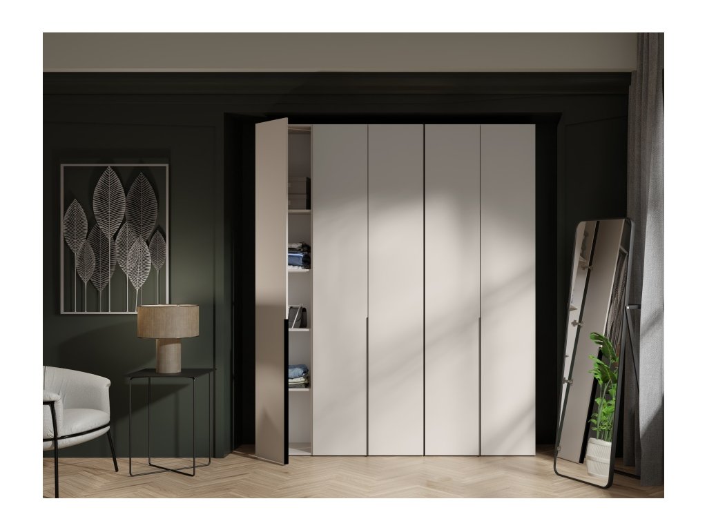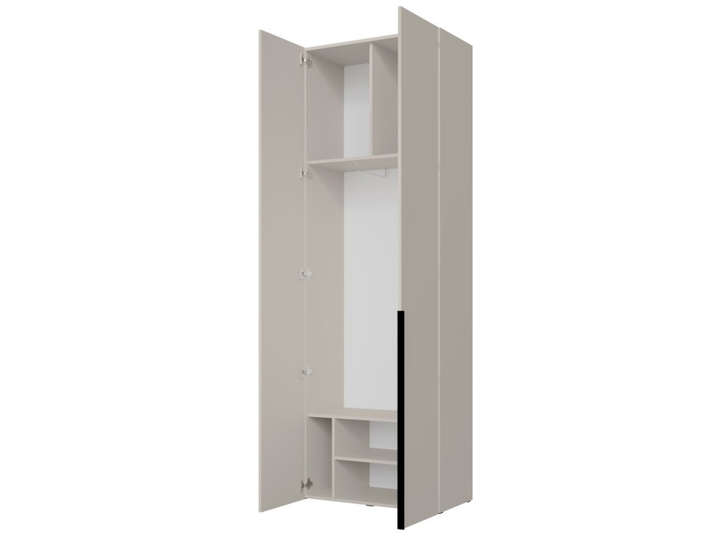 Dvojdverová skriňa ponúka praktické vnútorné členenie s policami, šatníkovou tyčou a spodnými priehradkami. Je dostupná v troch farebných prevedeniach a vyniká čistým, moderným dizajnom.