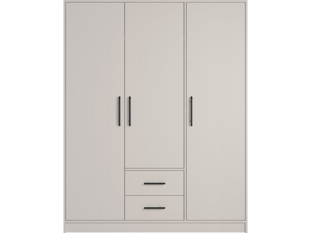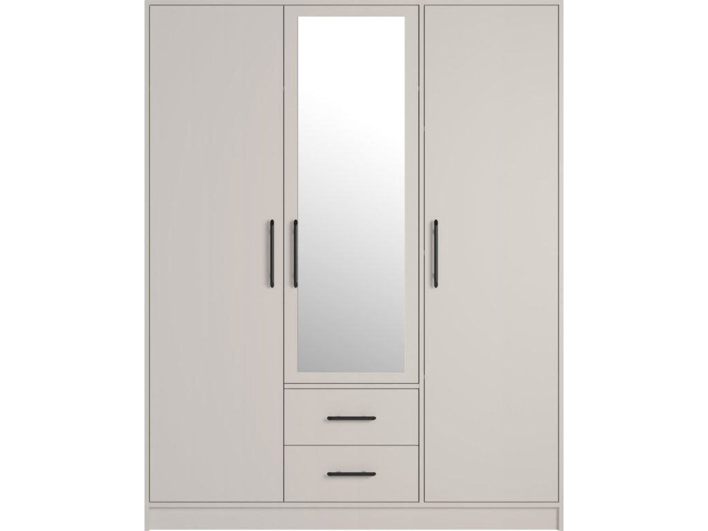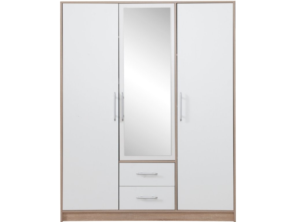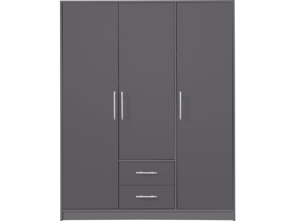 Moderná trojdverová skriňa s policami, vešiakovou časťou a dvoma zásuvkami. Možnosť dokúpenia zrkadla aj nadstavca. Dostupná v 4 farebných prevedeniach.