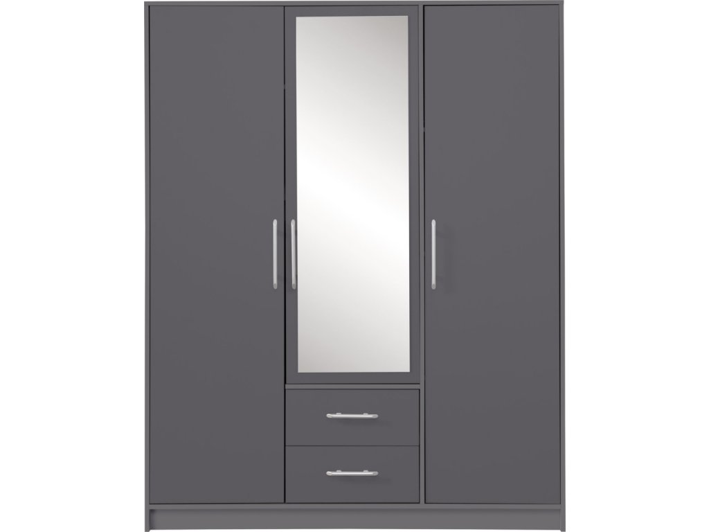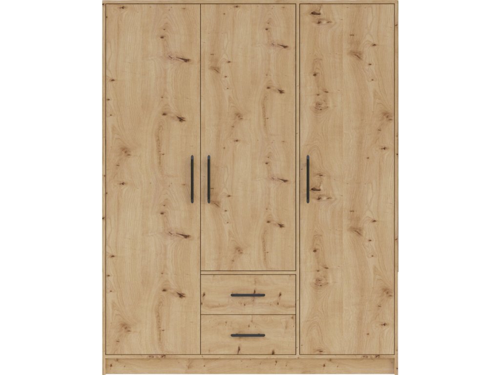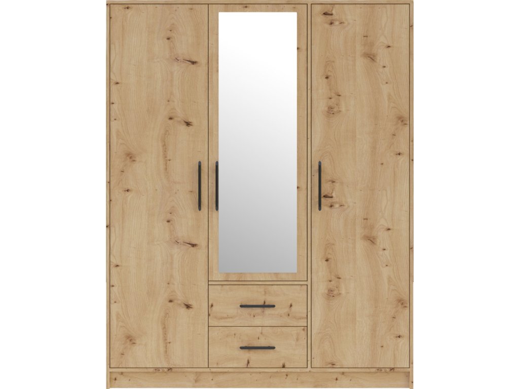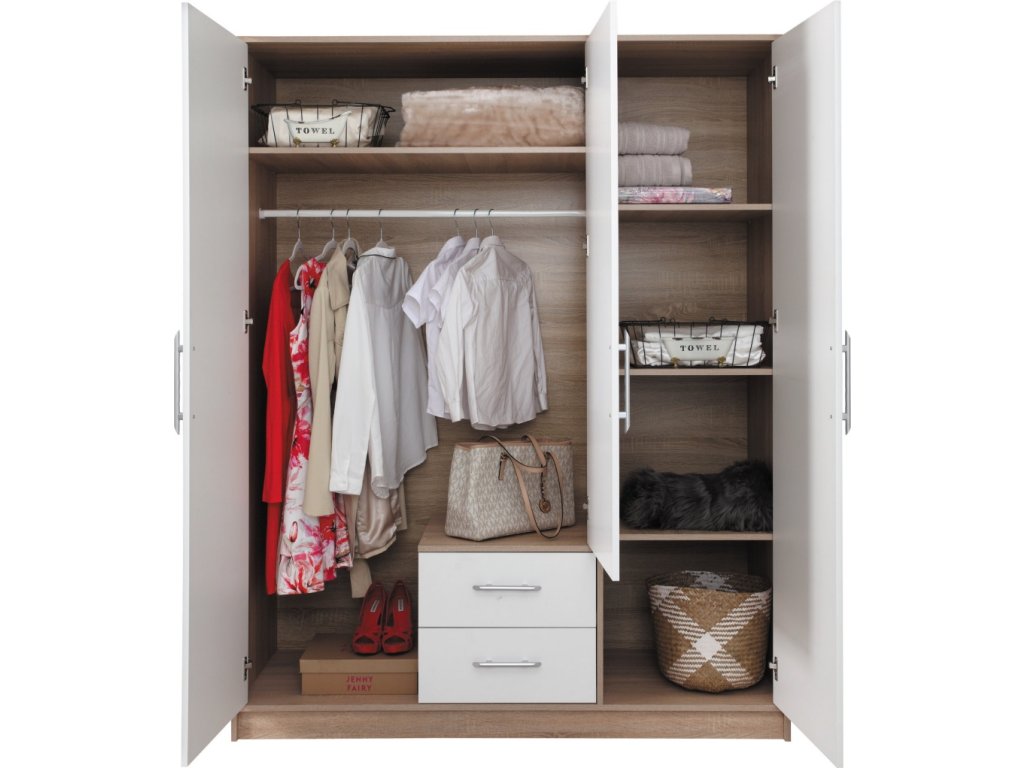 Moderná trojdverová skriňa s policami, vešiakovou časťou a dvoma zásuvkami. Možnosť dokúpenia zrkadla aj nadstavca. Dostupná v 4 farebných prevedeniach.