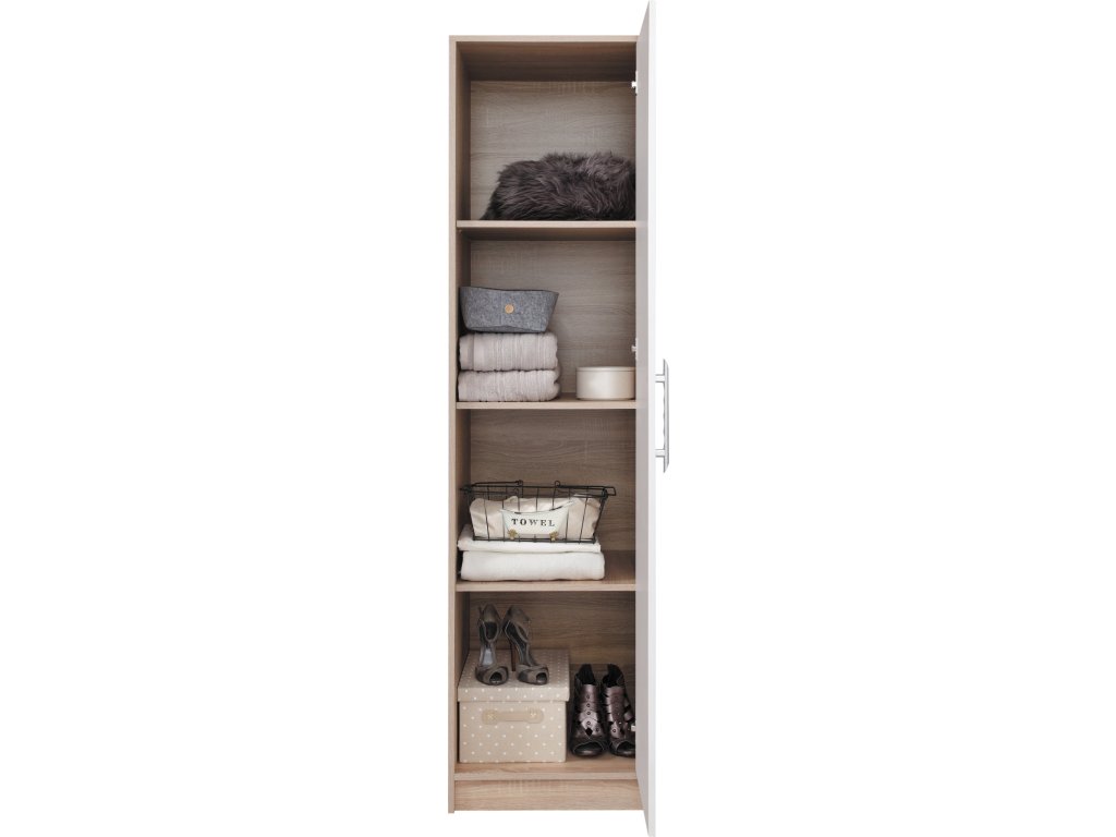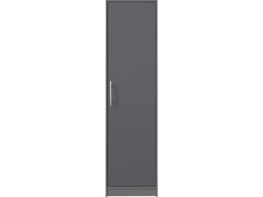 Jednodverová skriňa s policovým vnútrom ponúka praktický úložný priestor aj do menších izieb. Možnosť doobjednania nadstavca pre väčšiu kapacitu. Dostupná v 4 farebných prevedeniach.