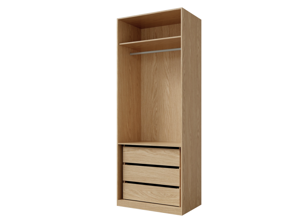 Šatníková skriňa s dvojdverovým prevedením ponúka kombinovaný úložný priestor – tyč na vešanie, policu a tri zásuvky. Dostupná v 2 farebných prevedeniach.