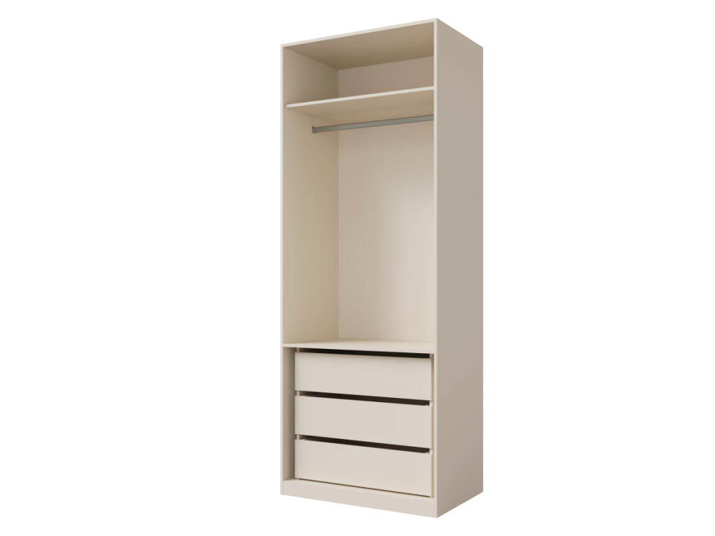 Šatníková skriňa Sorento 2D 90 je praktický a moderný kus nábytku určený na prehľadné uloženie oblečenia. Skladá sa z dvoch dvierok s integrovaným frézovaným úchopom, ktorý zároveň plní aj dizajnovú funkciu. Vnútorný priestor je rozdelený na hornú časť s policou a tyčou na vešanie odevov a spodnú časť s tromi zásuvkami, vhodnými na uloženie menších kusov oblečenia alebo doplnkov.