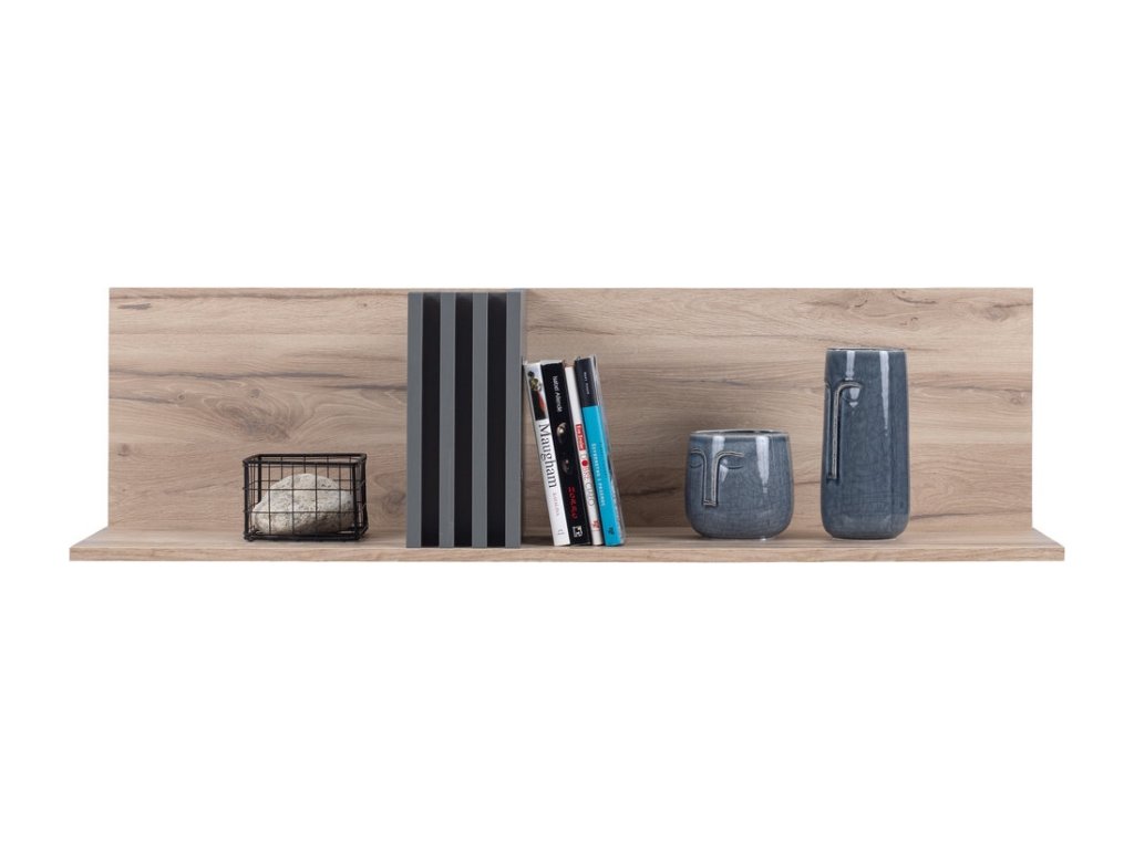 Moderná nástenná polica v jednoduchom, čistom dizajne poskytuje praktický priestor na odkladanie kníh, dekorácií či doplnkov. Výrazným prvkom sú vertikálne priečky, ktoré vytvárajú zaujímavý vizuálny detail a zároveň pomáhajú udržať knihy stabilne na mieste.